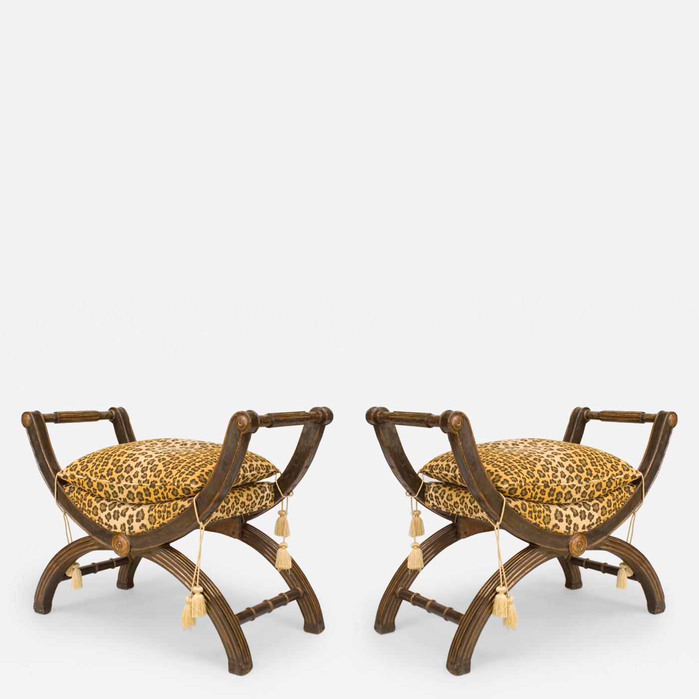 PAIR of Italian Neo-classic (19th Century) ebonized benches with gilt trim and "X" form design with fluted legs and side arms and faux leopard upholstered seat (PRICED AS PAIR).