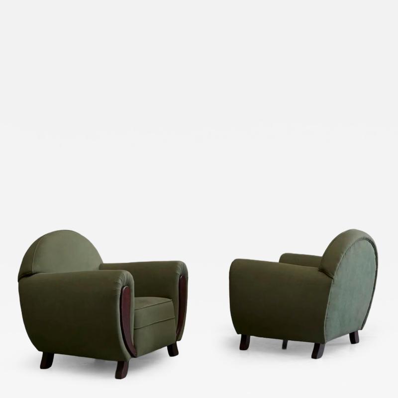 Pair of Large Art Deco Lounge Chairs in Solid Oak and Green Velvet