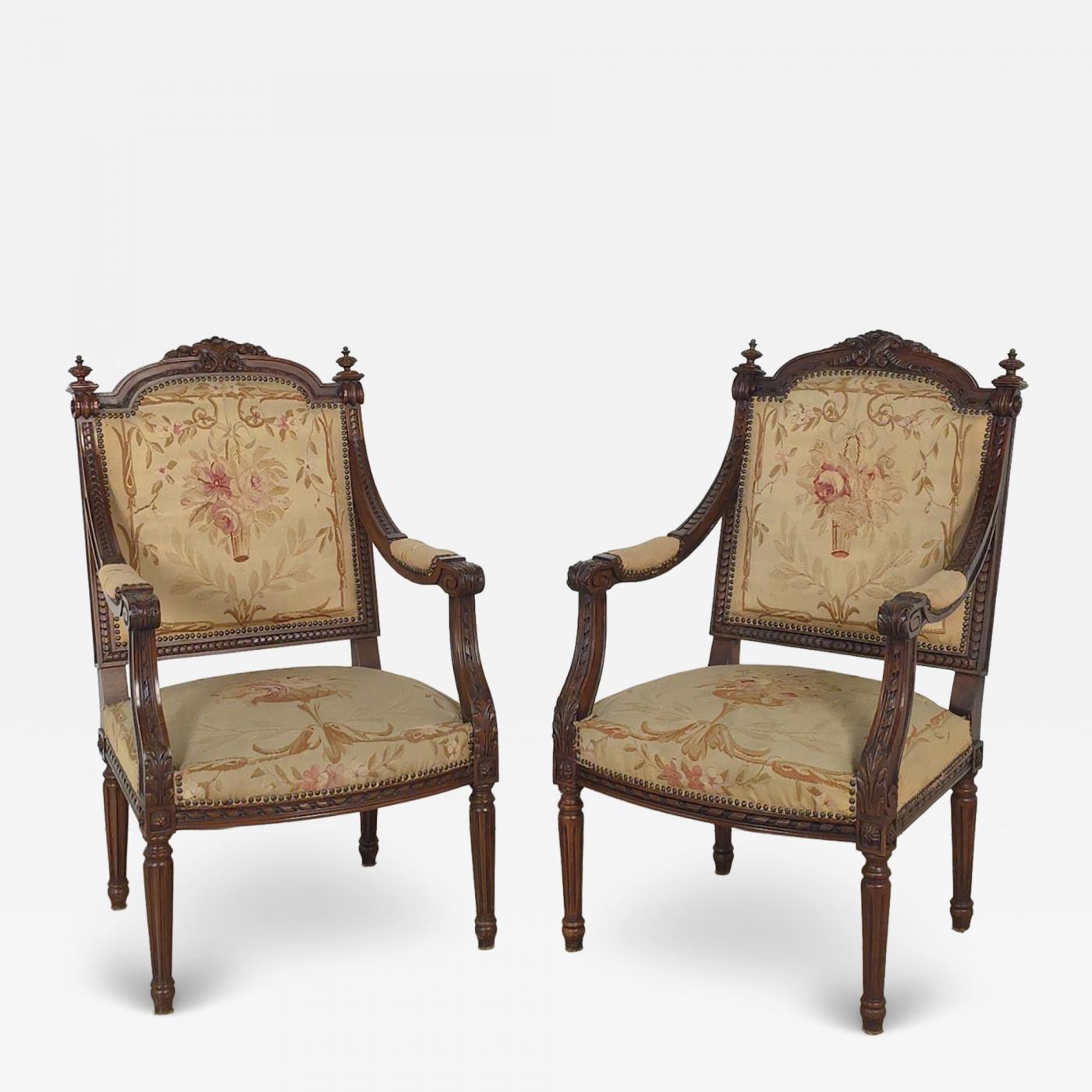 A pair of Louis XVI–style walnut/beech part gilt armchairs with aubusson tapestry upholstery. Seat height 16.5".
