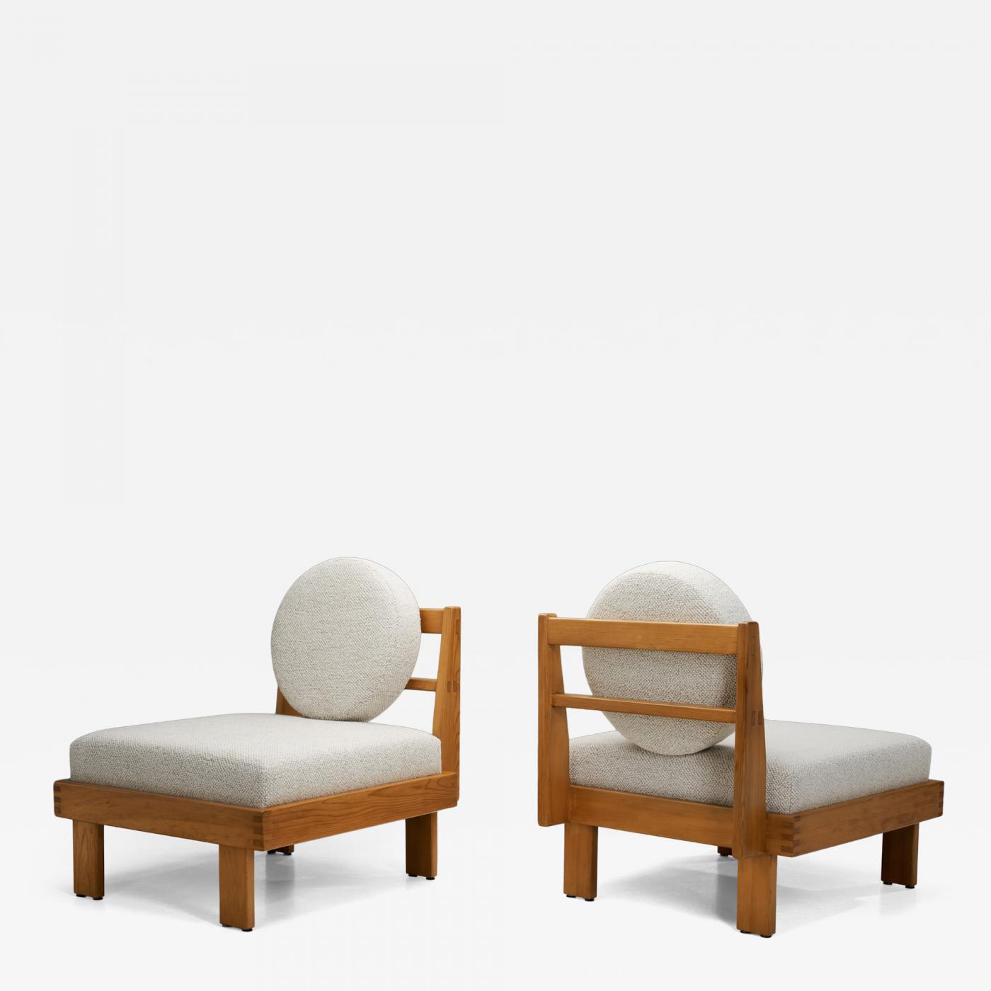 This pair of lounge chairs captures that spirit with its thoughtful interplay of geometry and tactility. The frames, crafted in solid wood with box joinery, celebrate craftsmanship while maintaining a striking simplicity. The low, grounded stance gives the pieces a quiet strength, while the broad seats invite relaxed, informal lounging. To complement the solid frame, the backrests feature a circular cushion, an unexpected sculptural element that softens the chairs’ rectilinear frames and adds visual interest without unnecessary embellishment. Upholstered in richly textured bouclé, the chairs pair a tactile, inviting surface with the clean lines of their timber base, achieving a compelling balance between warmth and restraint. The traditional joinery details are left visible, underscoring the mid-century belief in structural honesty and the inherent beauty of well-made construction.