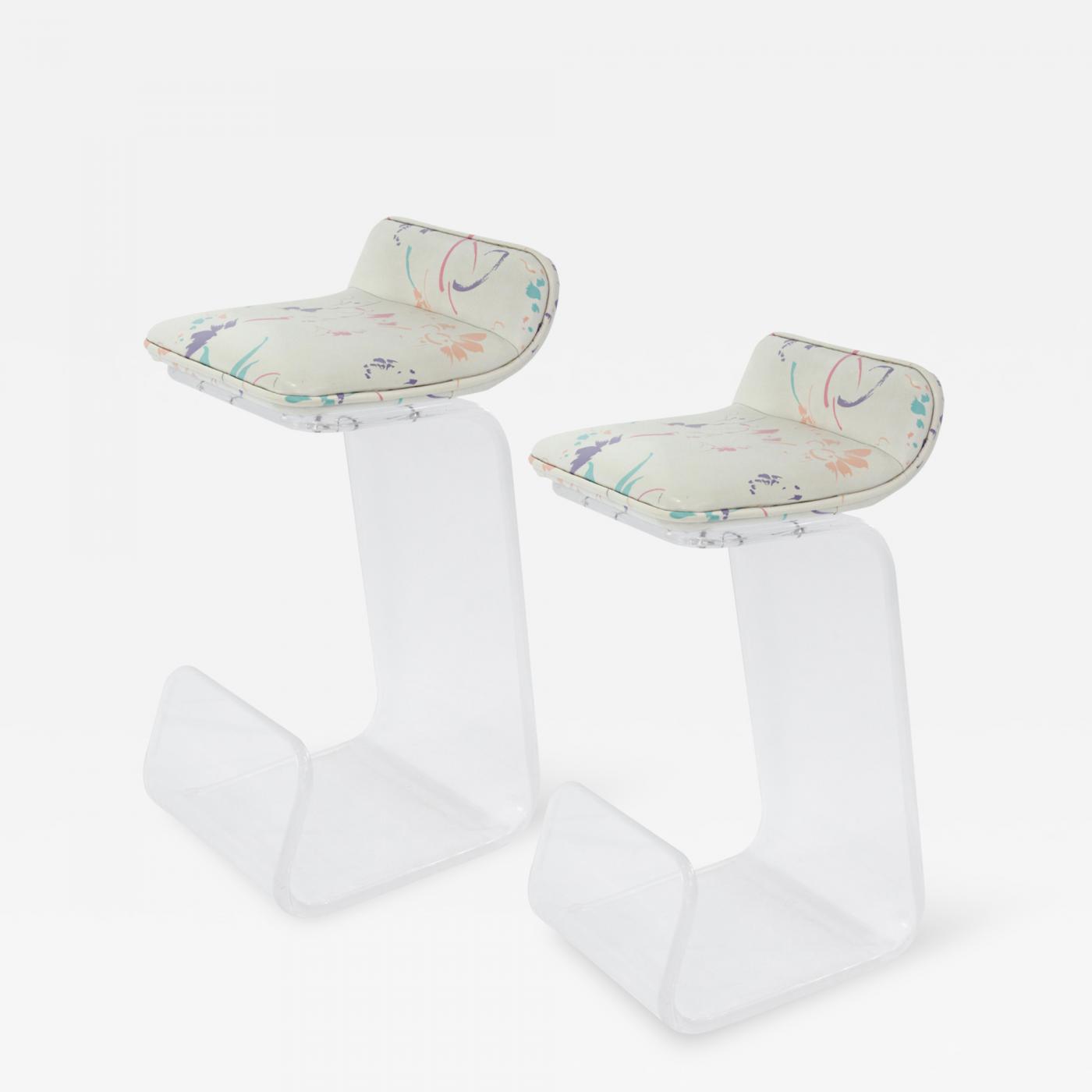 Pair of sculptural bar stools in thick molded lucite with upholstered seat and small back rest, American 1970's