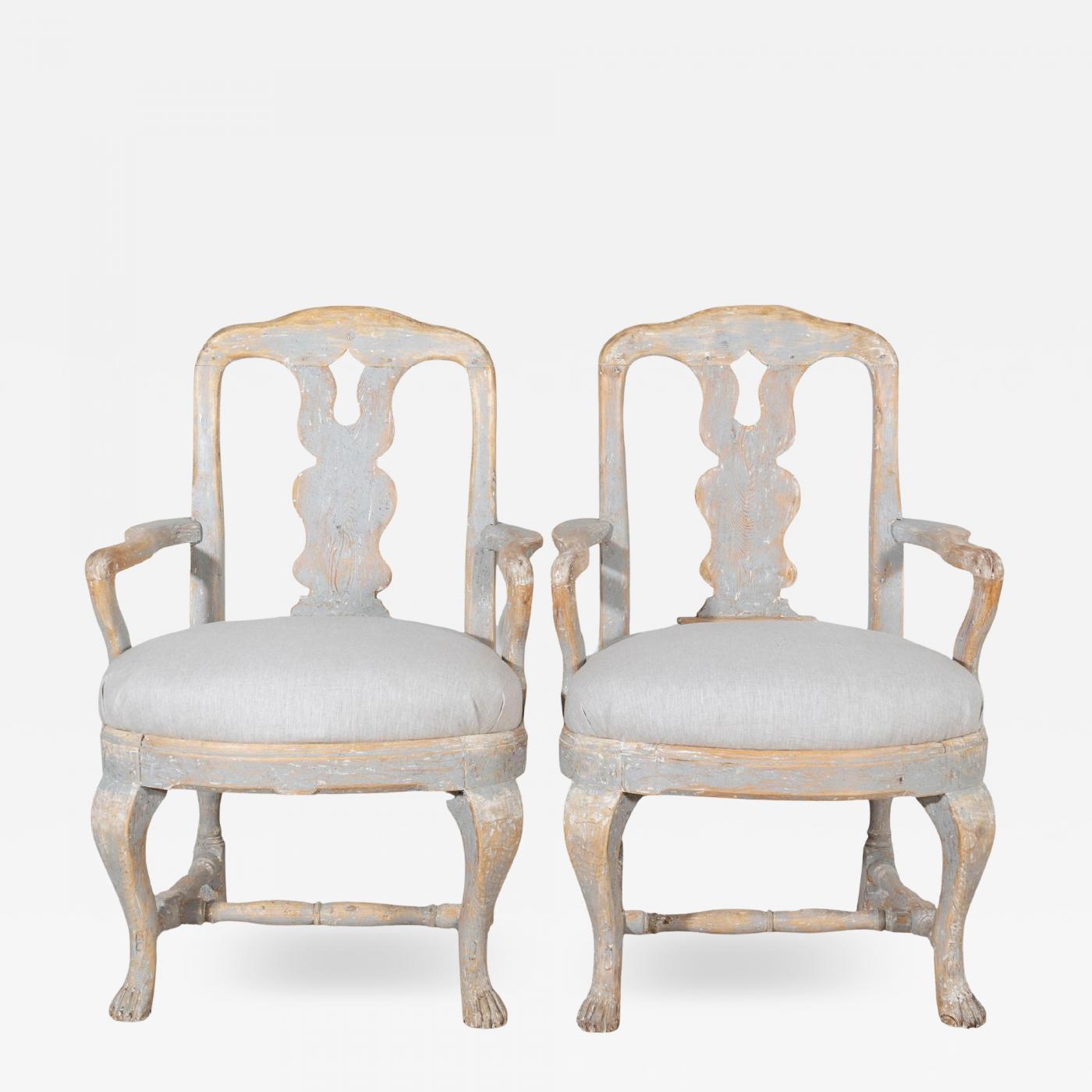 This graceful pair of Swedish Rococo armchairs embodies the refined curves and expressive craftsmanship of 18th-century Scandinavian design. Elegantly carved from wood and retaining traces of their original paint and patina, the chairs display the soft, timeworn finish so prized by collectors and designers alike. The sculpted backs feature fluid, asymmetrical lines and pierced splats, while the cabriole legs terminate in carved paw feet — a hallmark of Rococo exuberance and artistry. The generously proportioned seats have been newly upholstered in a neutral linen, providing a fresh complement to the aged frames. With their sinuous silhouettes, scrolling arms, and rich historical character, these armchairs serve as striking statement pieces in both classical and contemporary interiors. Perfect for a salon, library, or entryway, they embody the elegance and lightness of the Rococo period while offering the comfort and sophistication expected of timeless Swedish craftsmanship.
