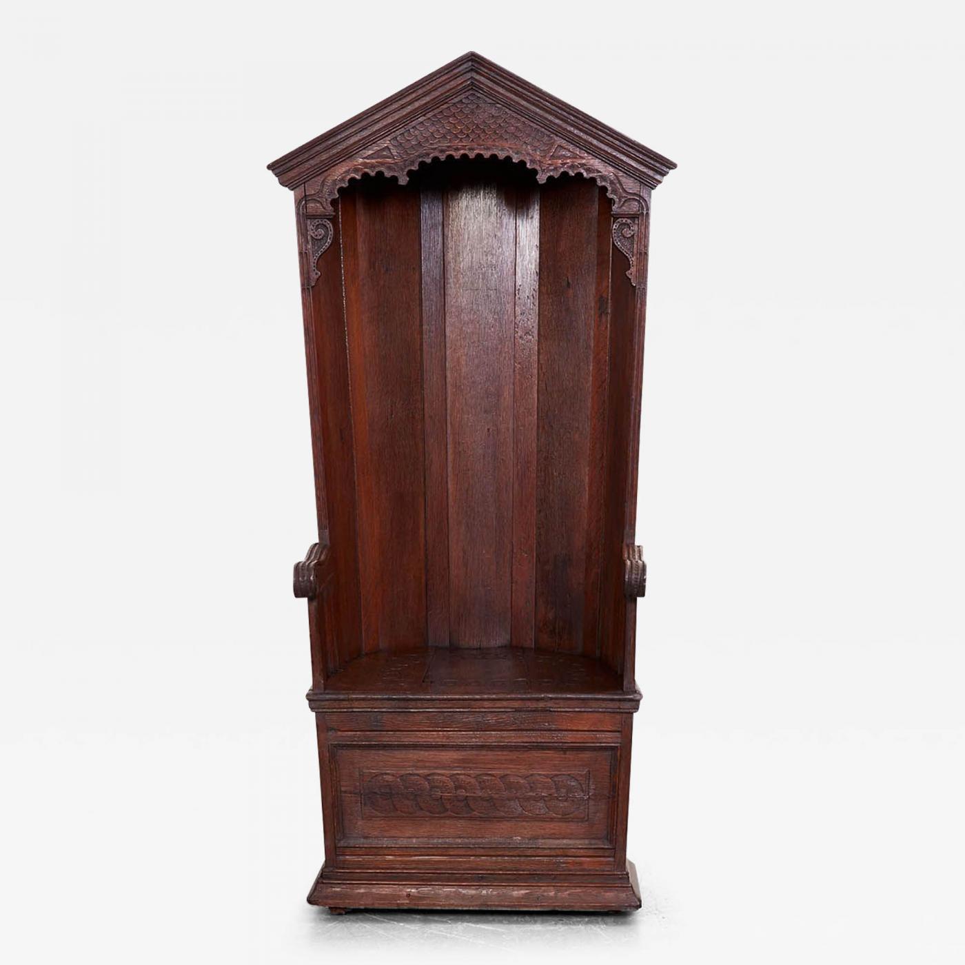 A magnificant 19th century oak porter's chair with a five point shaped hood above a carved arch, surrounding a seat and arms, the back equally made for show and finished with architecturally formed side panels over a lower dado rail, matching panels below, and an ogee molded base. Very cosy.
