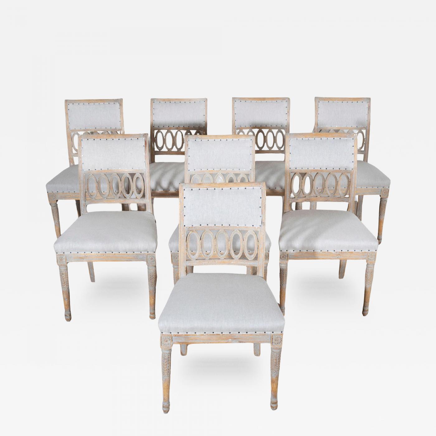 A rare and elegant set of eight period Gustavian side chairs, crafted in Lindome, Sweden, circa 1800. These chairs exemplify the refined neoclassical aesthetic for which Gustavian furniture is celebrated, with delicate proportions, carved details, and distinctive oval openwork backs that lend a light and graceful presence. The frames have been later painted in a soft bluish-grey tone, gently distressed to highlight the original carvings and patina beneath. Newly upholstered in a natural linen, the chairs balance antique character with fresh, understated sophistication. The seats are generously sized and comfortable, making them ideal for dining or as occasional chairs throughout the home. A timeless addition to both traditional and contemporary interiors.