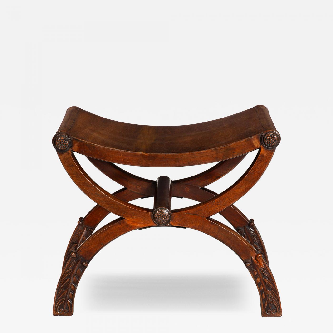 Item # 403PHK02S Inspired by Greek antiquity, the present example is a very finely made "curule" bench of the Regency period. Executed in mahogany and mahogany veneers, the stool showcases a perfect sense of balance - note the graduation of curves, first gentle in the dish of the seat, more severe in the arch raising the seat and nearly full demilune in the arch of the legs to the ground.