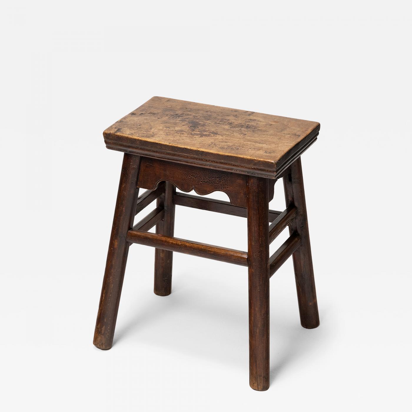 Depth: 12" // This Chinese courtyard stool dates to the mid-19th century and has a classic splayed leg design with round legs and a rectangular seat. The stool is crafted of northern elmwood (yumu) using traditional mortise and tenon joinery, plus the added support of the occasional nail. The seat is formed from a solid plank of elm with ridged sides and smoothed top surface burnished from years of use. The splayed legs are reinforced with straight stretchers and topped by a simply carved apron on each side. The rustic stool is brushed with a thin layer of brown lacquer, now richly aged and crackled in some areas for a crazed texture.
