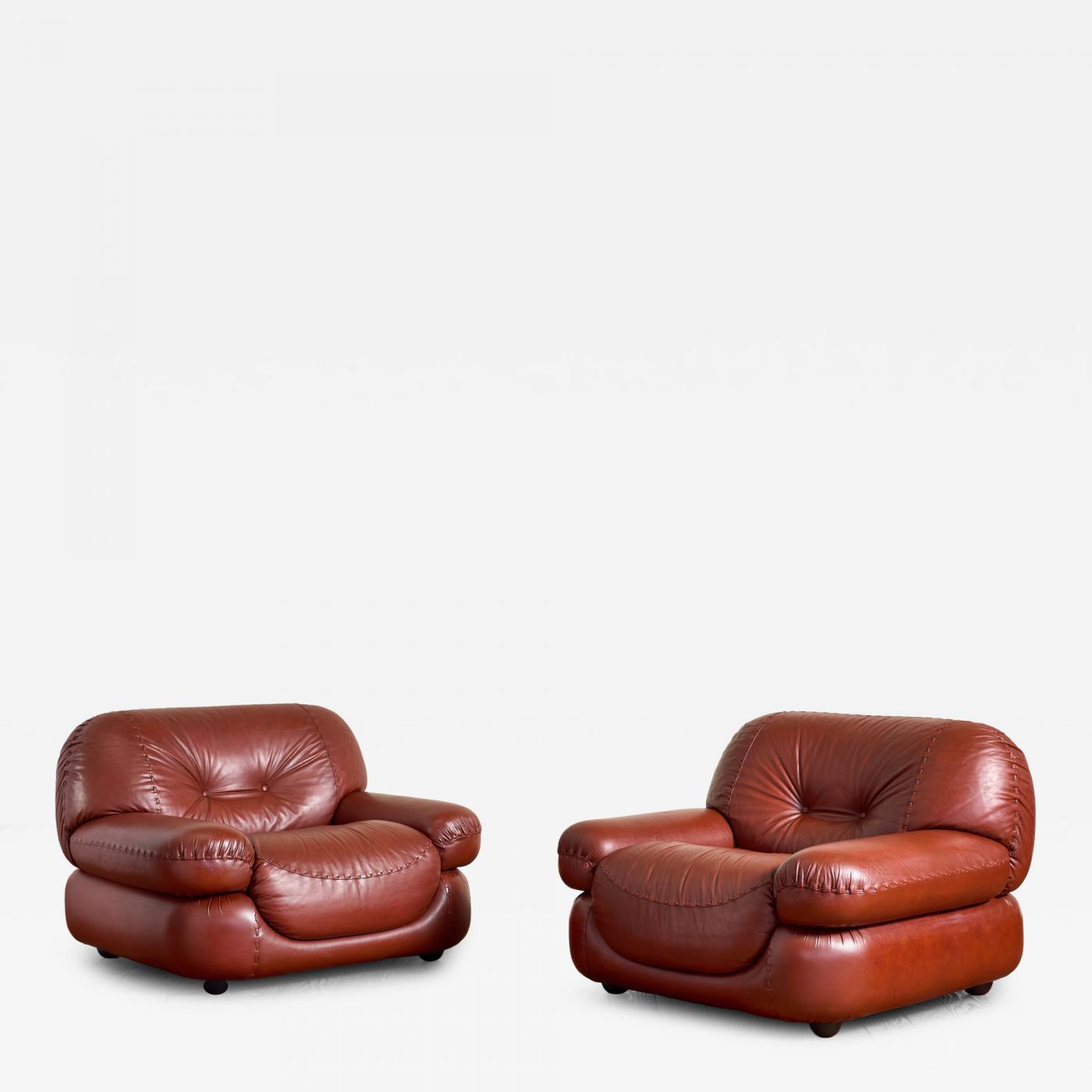 Large pair of Sapporo armchairs by Mobil Girgi - Cantù, Italy 1970s Sculptural form with a bold, rounded silhouette Tufted leather cushions with woven stitch detailing. Original production mark present - completely restored