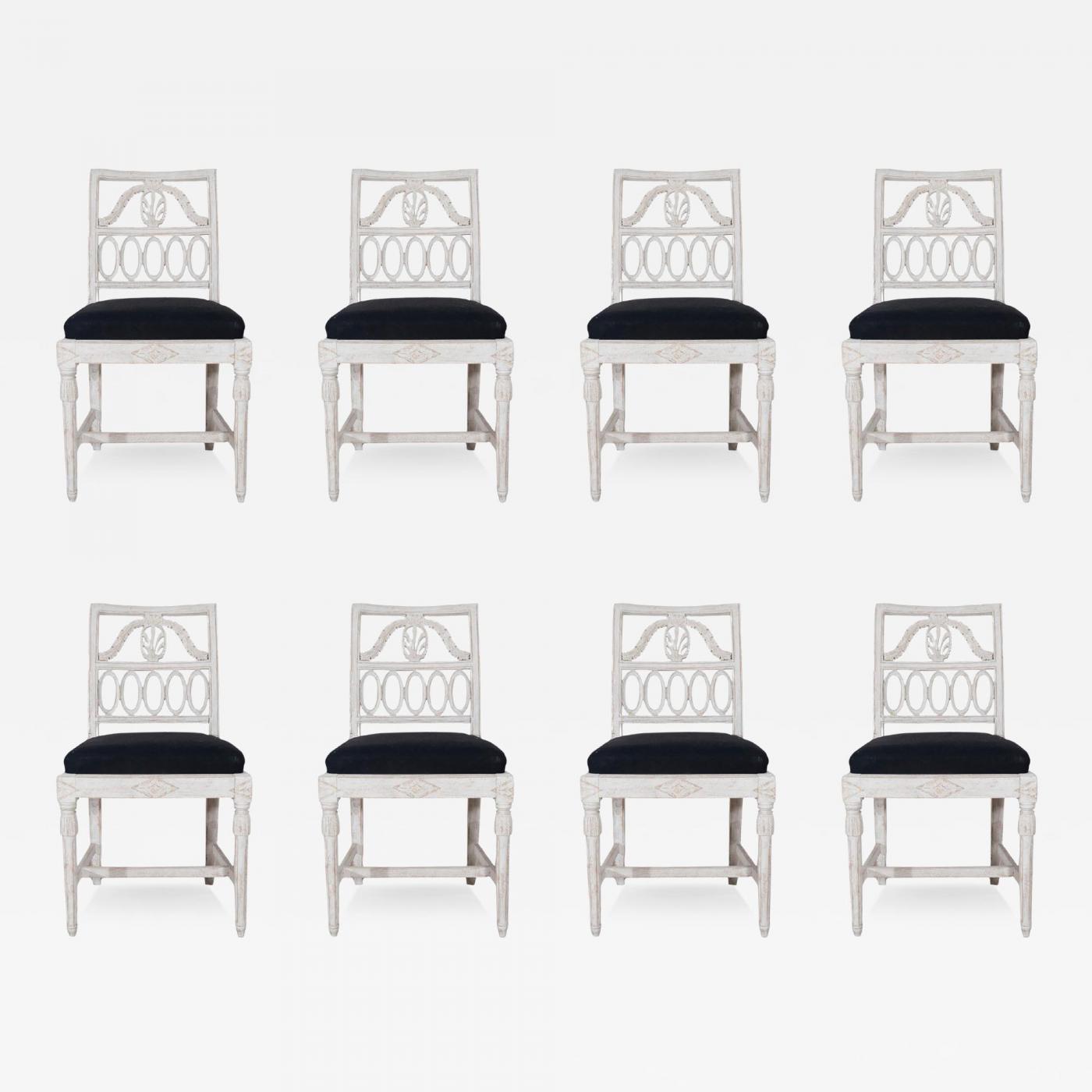 Elegant set of eight Swedish dining chairs from the Gustavian period, circa 1820, finely carved and retaining their original pale patinated finish. Each chair features an openwork backrest with neoclassical oval and sunburst motifs, reflecting the refined symmetry and lightness characteristic of early 19th-century Swedish design. The seats are newly upholstered in dark fabric, creating a sophisticated contrast with the aged white surface. Standing on fluted legs with carved rosettes at the corners, the chairs exhibit both structural balance and graceful proportion. The craftsmanship is meticulous yet restrained, lending timeless versatility to both formal and modern interiors. A superb and cohesive set that embodies the understated grandeur of Gustavian style—rooted in French neoclassicism but distinctly Scandinavian in its simplicity, color palette, and sense of harmony.