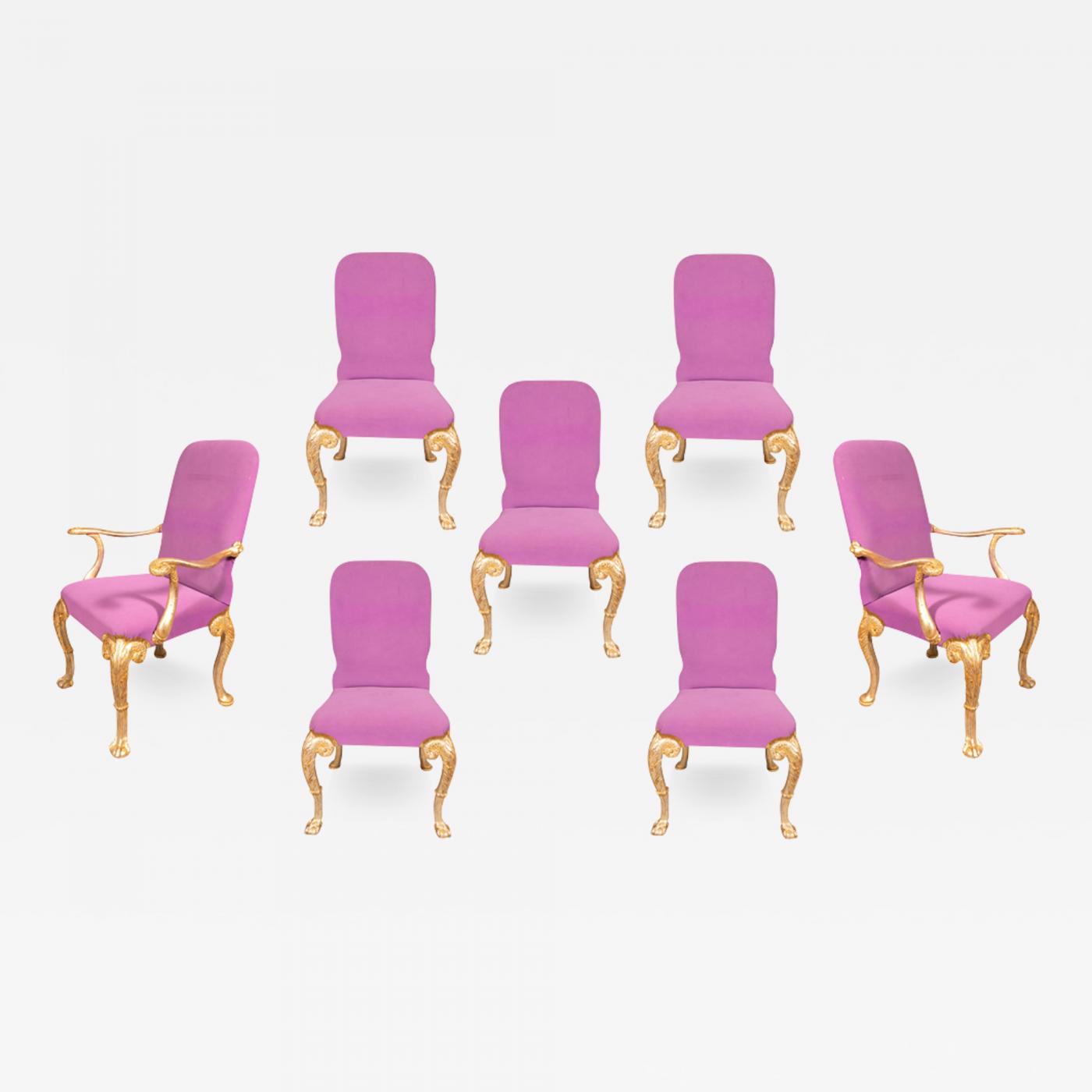 Set of Seven George I Style Giltwood Dining Chairs made in Italy and well carved and water gilded comprising two armchairs and five side chairs. Arched backs rounded seat raised on acanthus and phoenix bird carved cabriole legs ending on ball and claw feet.