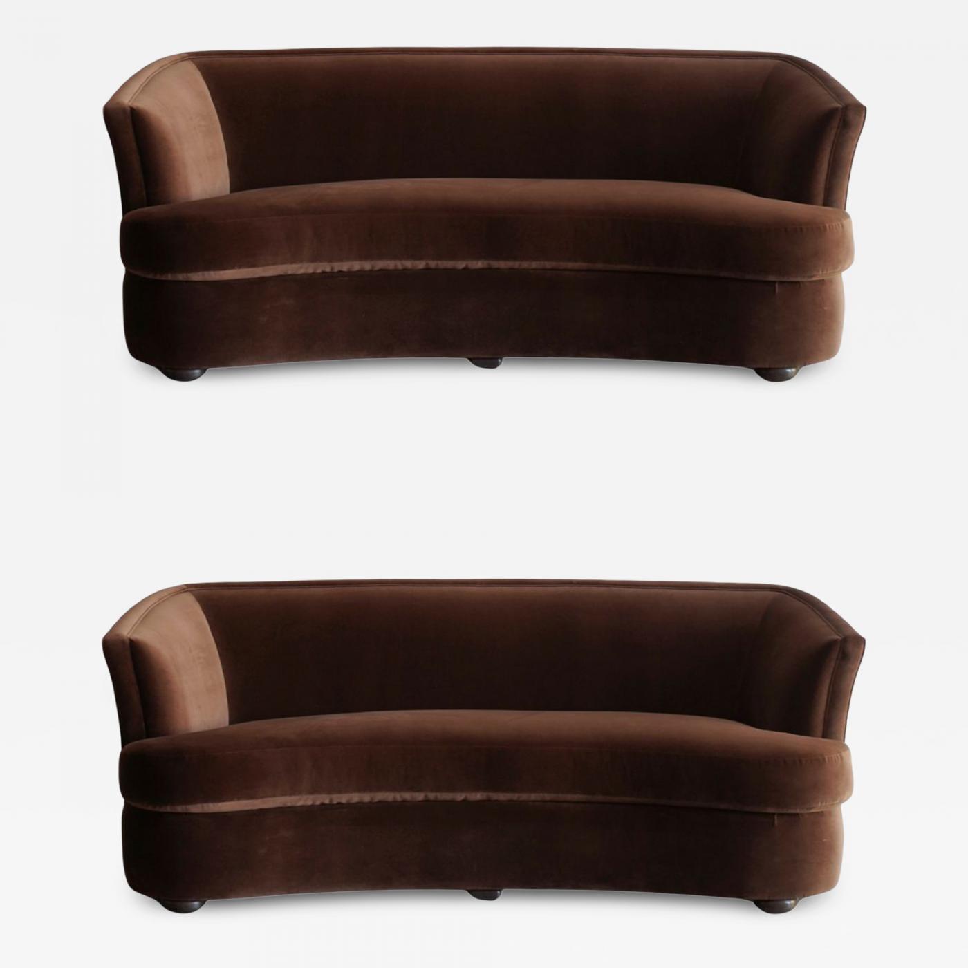 Reupholstered in a rich brown cotton velvet, the sofas present a luxurious hand and a warm, inviting tone ideal for sophisticated interiors. The walnut legs have been expertly refinished in a deep dark-walnut stain, highlighting the craftsmanship and adding a grounded, sculptural detail.