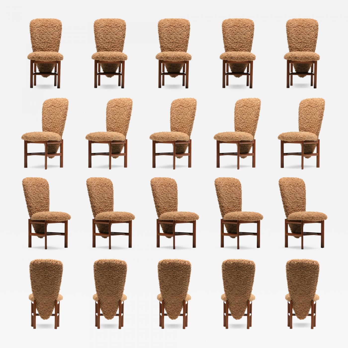 Front, side and back this jaw dropping large set of 20 teak Danish Modern Chairs delivers a bold and incredibly inviting silhouette big enough to fill any large dining space. The only set of its kind available globally, this set is all 10s. High quality Danish craftsmanship meant to last generations, a unique architectural silhouette that's unexpected, and a comfortable dining experience meant to extend dinners late into the night. A marriage of Post Modern and Danish Modern design with tall fin backs that frame your guests in architectural delight. Plush seat cushions keep the conversations flowing. Teak frames in a chestnut satin finish complete the cozy warm architectural vibe. Newly redone from top to bottom with new camel teddy bear fabric rated highly durable that cleans up well. Luxuriously soft curly texture ventilates and works in all climates. A standout addition to any dining space not to be seen or experienced elsewhere. Ready to ship.