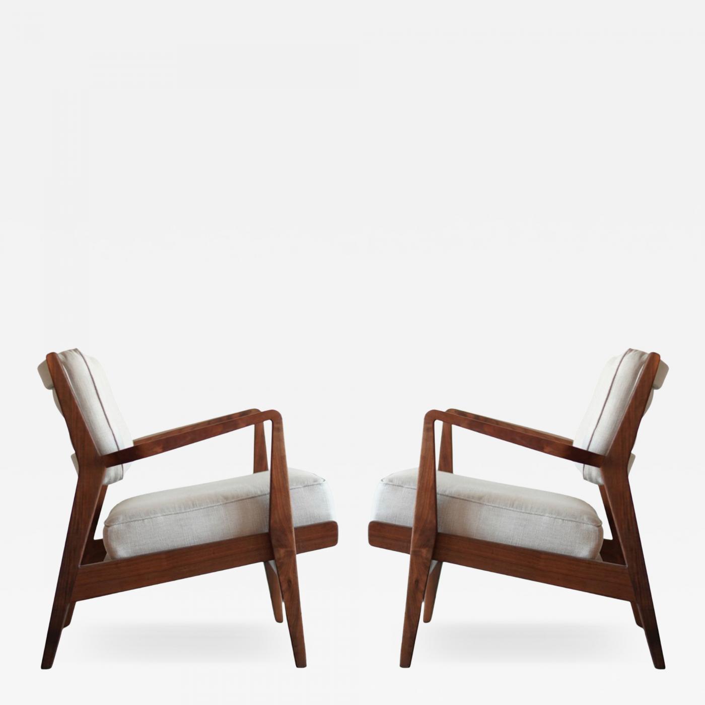 Experience the epitome of mid-century modern elegance with our fully restored walnut lounge chairs from the 1950s, a timeless creation by Jens Risom for Risom, Inc. Meticulously refurbished and reupholstered in luxurious Gray Linen, these chairs effortlessly blend vintage charm with contemporary allure.
