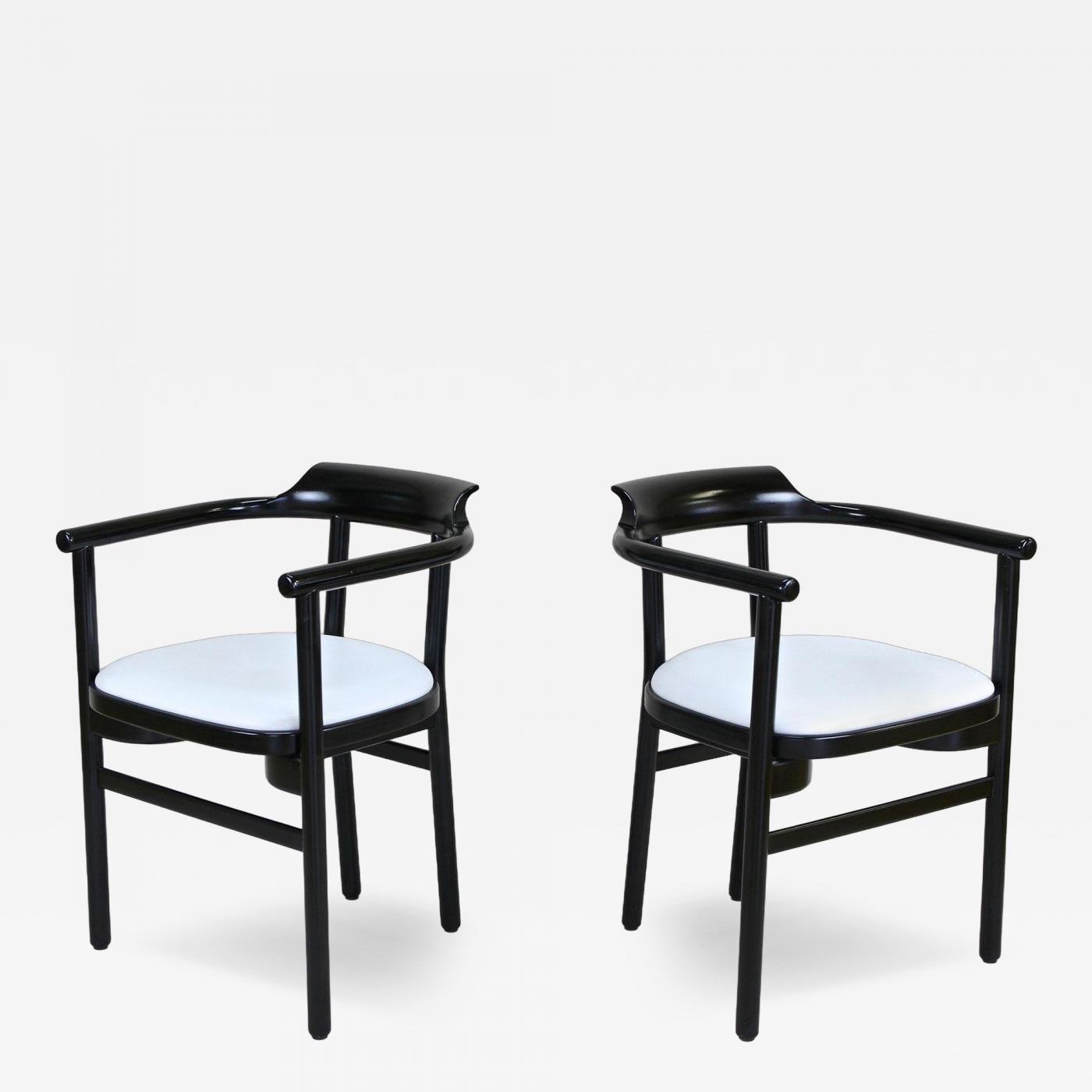 Amazing looking pair of black lacquered 20th century armchairs made by the renowned company of Thonet Vienna. These absolutely timeless designed black armchairs from the late 20th century around 1980 impress with elegant lines and were crafted out of solid beechwood. The still original white leather upholstery shows minimal signs of use and age and build a great contrast to the black frames. A truly fantastic, timeless designed pair of contemporary armchairs from the 1980s in Austria, manufactured by the famous company of Thonet Vienna.