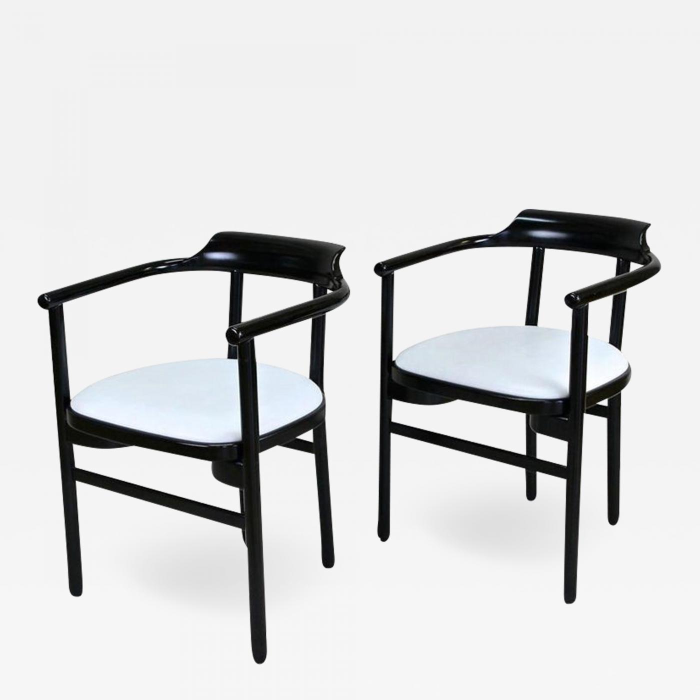 Incredible looking pair of black lacquered armchairs made by the renown company of Thonet Vienna around 1980. These timeless designed black armchairs from the late 20th century impress with elegant lines and were crafted out of fine beechwood. The still original white leather upholstery shows minimal signs of use and age and build a great contrast to the black frames. A really fantastic, timeless designed pair of contemporary armchairs from the 1980s in Austria, manufactured by the famous company of Thonet Vienna.