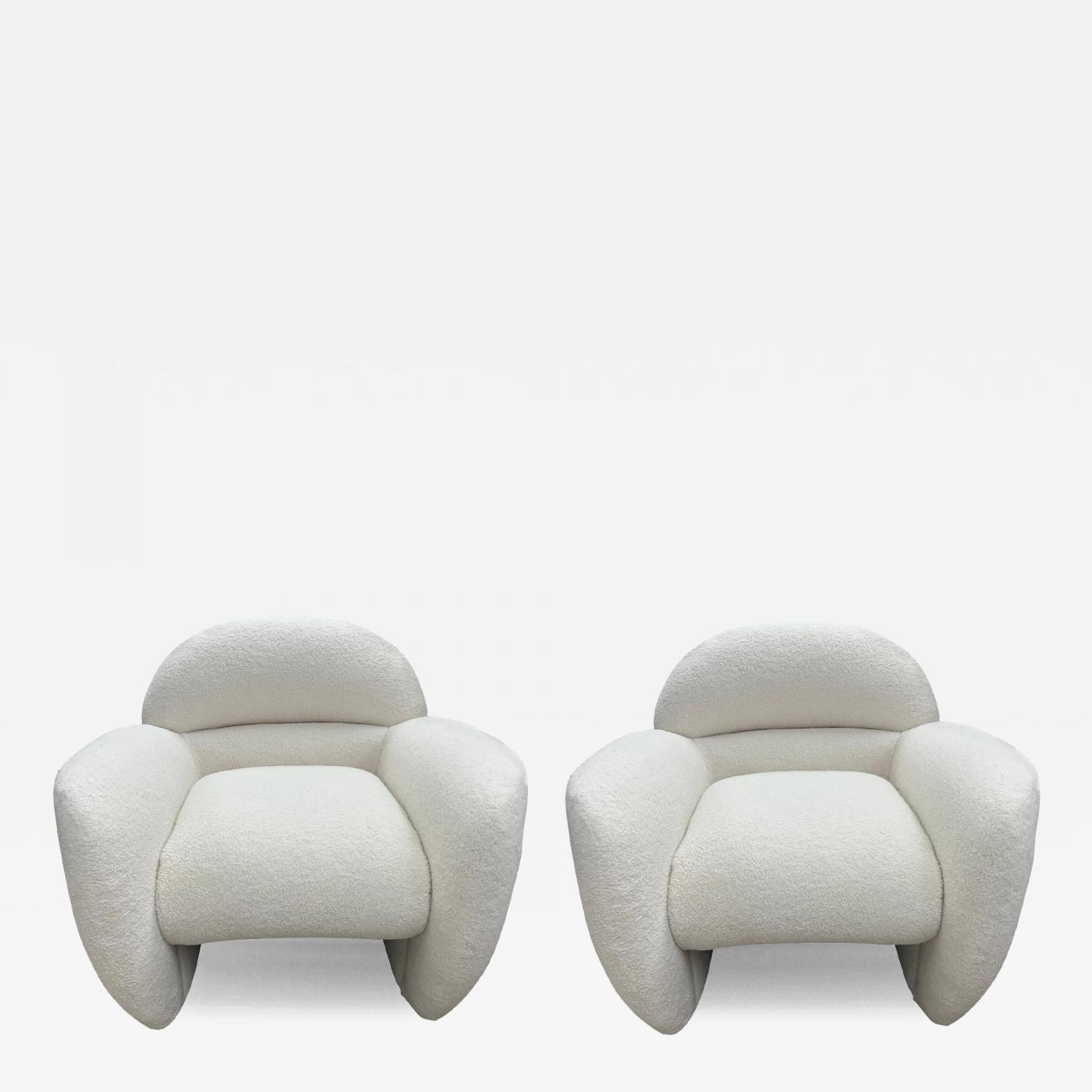Offered is a splendid rare pair of club chairs, lounge chairs or side chairs designed by Vladimir Kagan for Preview Furniture Company in the early 1990's. We have taken these large, comfortable chairs and had them professionally upholstered in plush white boucle fabric.