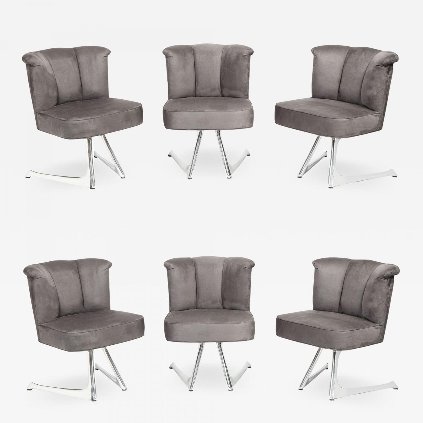 Very rare set of 6 “Unicorn Dining Chairs” with polished aluminum bases and upholstered seats with channeled backs by Vladimir Kagan for Kagan-Dreyfus Inc., American 1960’s (signed with original Kagan-Dreyfuss Inc. paper labels under seat). This remarkable set of Unicorn Dining Chairs is the only one we have ever seen come to market. Bases professionally cleaned and polished polished and seats reupholstered with gray ultra suede. These chairs are the very best of Kagan.