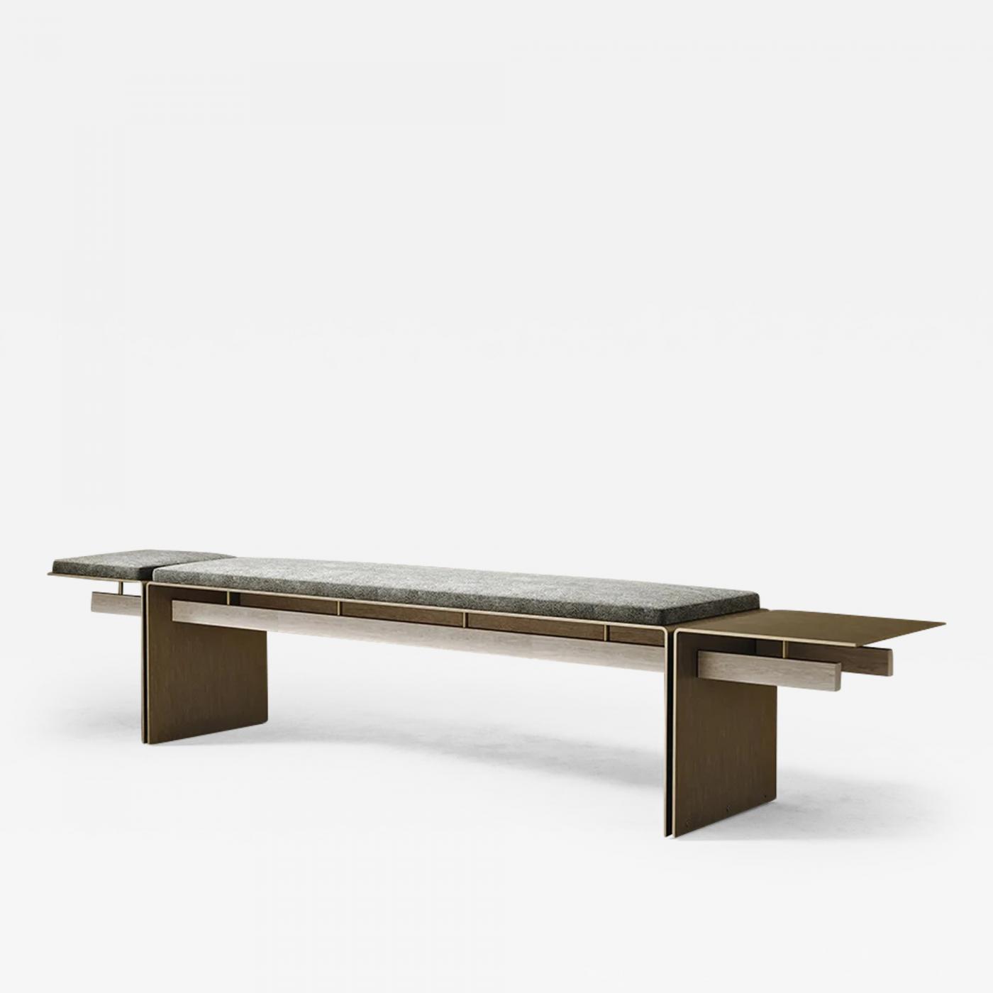 An architectural interplay of solid wood and metal, this elegant bench melds structure and materiality. Slender wood feet ascend to joined bent metal forms intersected by wood stretchers—all anchoring white leather upholstery. The elegant, functional bench displays the innovative design of the collection—featuring intriguing reveals, impeccably edited dimensions, and a refined hand given life by master artisans.