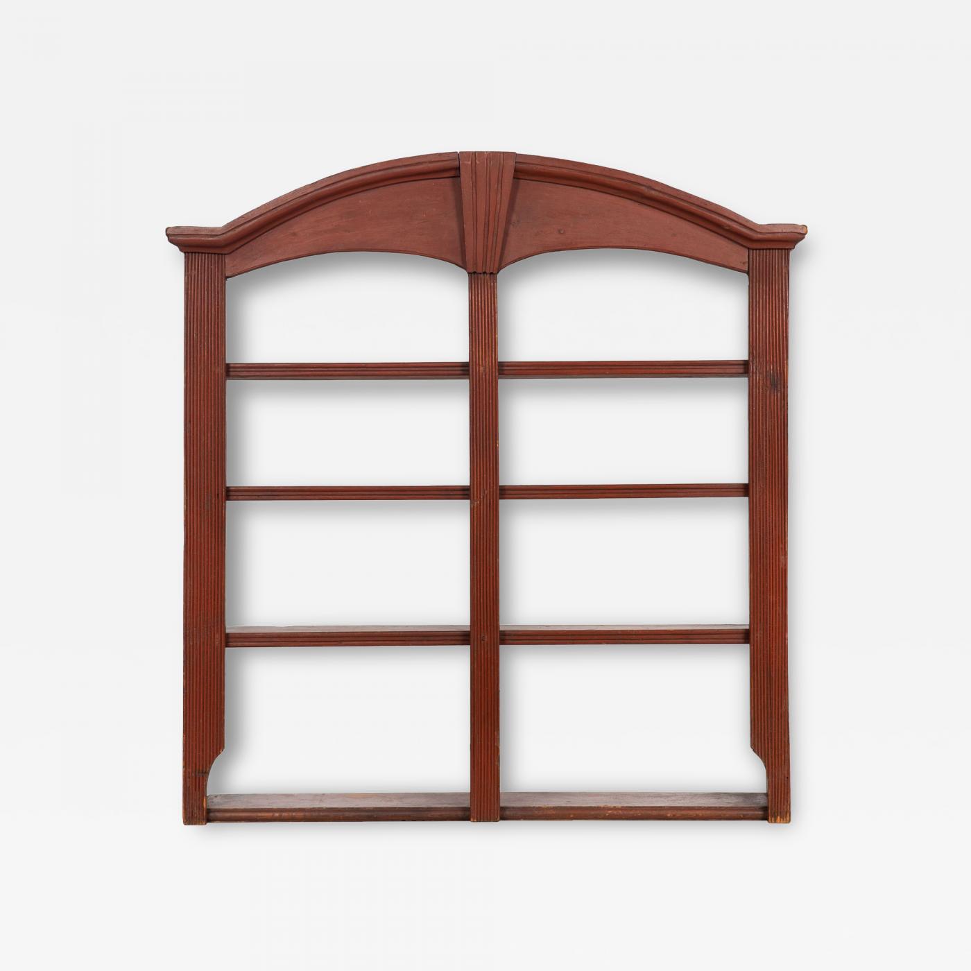 A compelling and most useful open bookcase, the simple and austere form features an arched and molded cornice around a central tapered-and-fluted wedge over four graduated shelves that are dovetailed into the stiles, the shelf edges decorated with reeding and wonderful tight reeding along the length of the pilasters. The wall shelf retains a fine early and perhaps original red painted surface.