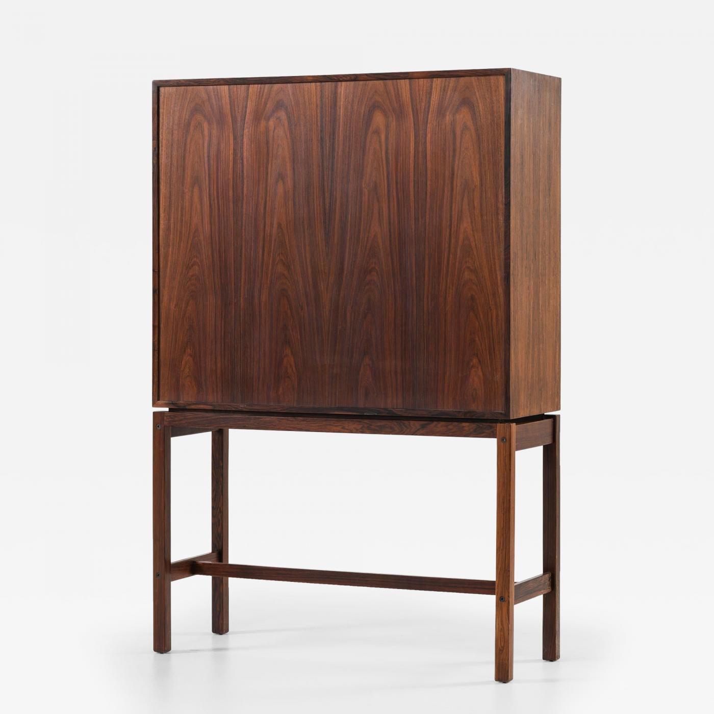This freestanding cabinet, attributed to Børge Mogensen and produced by Fredericia Møbelfabrik in Denmark during the 1960s, represents a refined example of Scandinavian modern craftsmanship. Constructed from rosewood, the cabinet showcases a highly figured grain pattern that enriches the depth and natural warmth of the wood. It is supported by a solid rosewood base with squared legs, reinforcing the clean, architectural lines that are characteristic of Mogensen’s design ethos.
