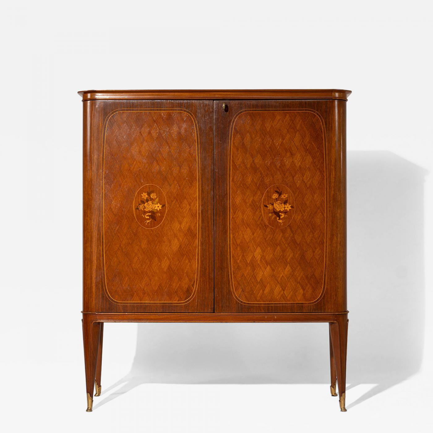 Bar cabinet, Italy, 1950s. Designed in the refined style of Paolo Buffa, this exquisite piece exemplifies the Italian mid-century neoclassical aesthetic. Meticulously crafted with exceptional attention to detail, the cabinet features a sophisticated structure in inlaid woods of various species, elegantly adorned with floral marquetry motifs. The interior reveals mirrored glass panels that enhance the sense of depth and luminosity, complemented by finely executed brass fittings and trim. Resting gracefully on slender, tapered legs with brass sabots, the cabinet balances luxury with understated elegance. Both decorative and functional, it reflects the craftsmanship and artistic sensibility of postwar Italian design, where traditional artistry merged harmoniously with modernist proportions and timeless sophistication. A distinguished statement piece for the discerning collector or interior.