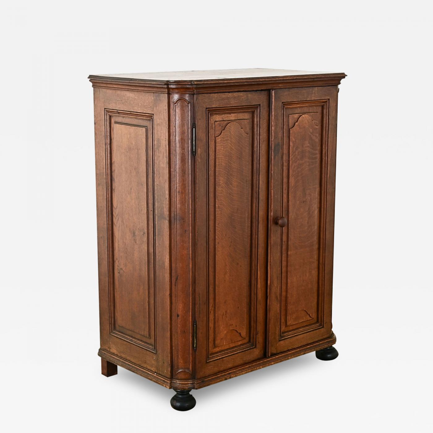 A two door Belgian solid oak buffet from the 1700’s. This cabinet is paneled on all three sides with rounded front corners. Two tall doors hang on barrel hinges and open using a turned wooden knob. The interior is fitted with six easy to use drawers with brass ring pulls over one removable 18 ¼” deep shelf. The cabinet is raised on a pair of ebonized bun feet. Cleaned and polished with a paste wax, this antique is ready for your immediate use. Be sure to view the detailed images to see its current condition.
