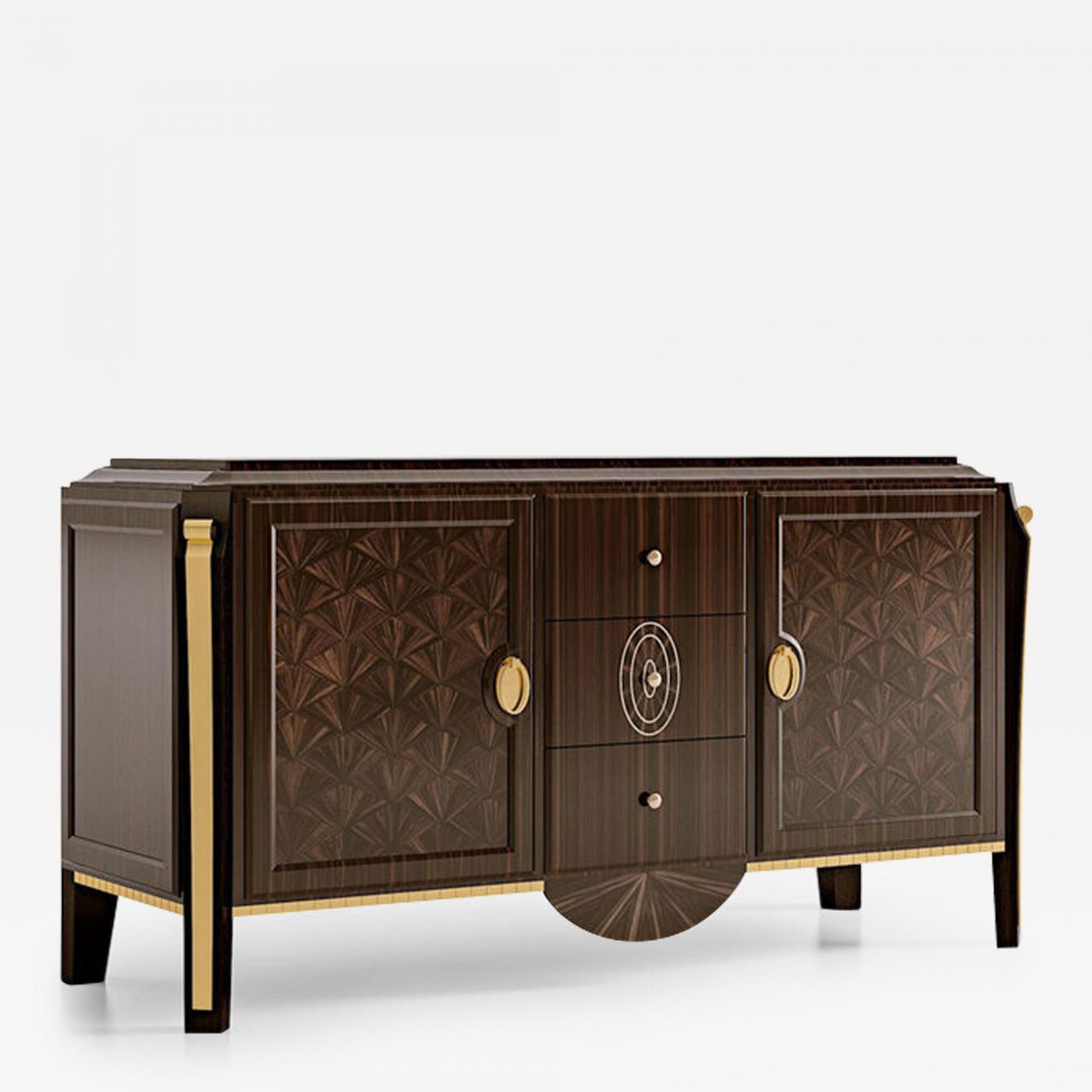 E02010 Sideboard with two doors and three drawers in Macassar ebony, gold plated metal elements, brass; 63″ x 18.1″ x 35″ h. -