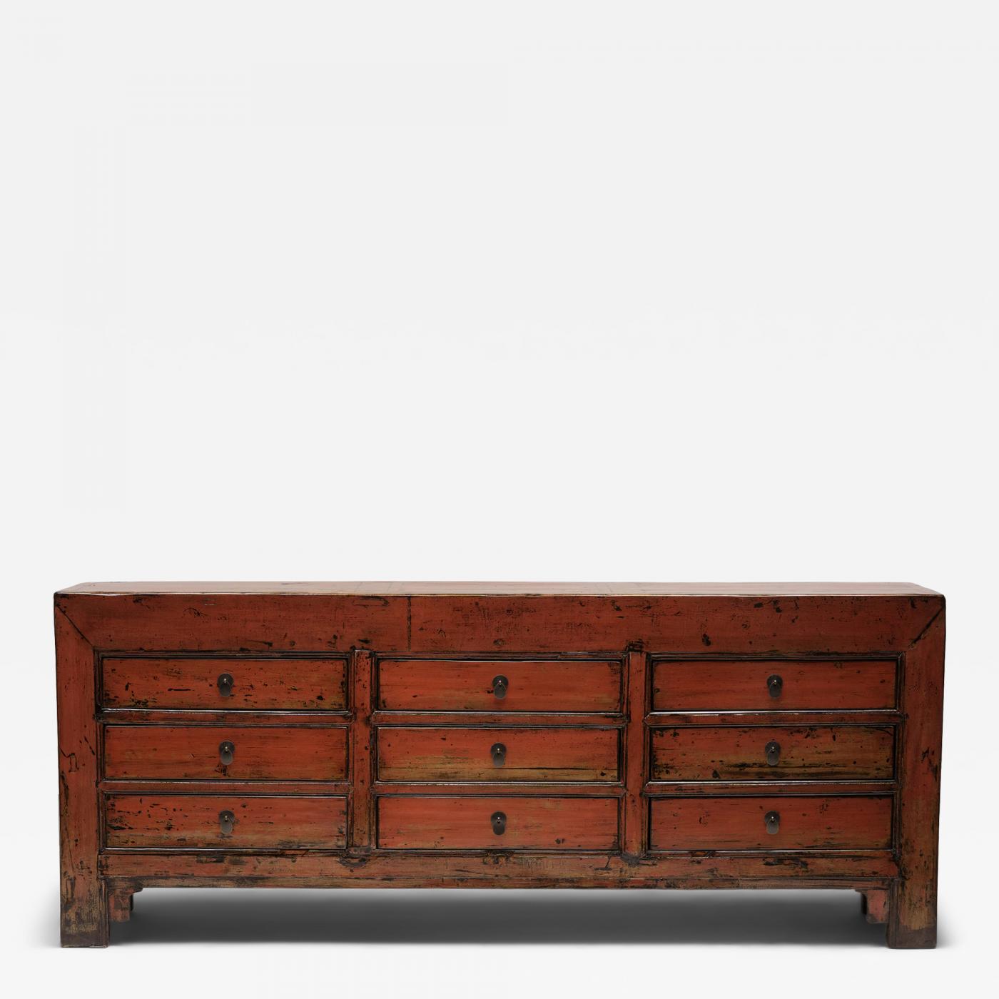 Depth: 17.75" // This 19th-century storage chest balances a streamlined silhouette with vibrant color and wabi-sabi textures. Originally configured to open from the top, the cabinet's paneled front has been modified into nine shallow drawers, each with a simple brass teardrop pull. The exterior has been brushed with a sheer layer of red-orange lacquer atop a heavily worn finish for renewed vibrancy and a richly textured surface. The lacquer's warm red color and cloudy opacity reminds us of red coral or carnelian stone, two fine materials known for their beauty and protective qualities.