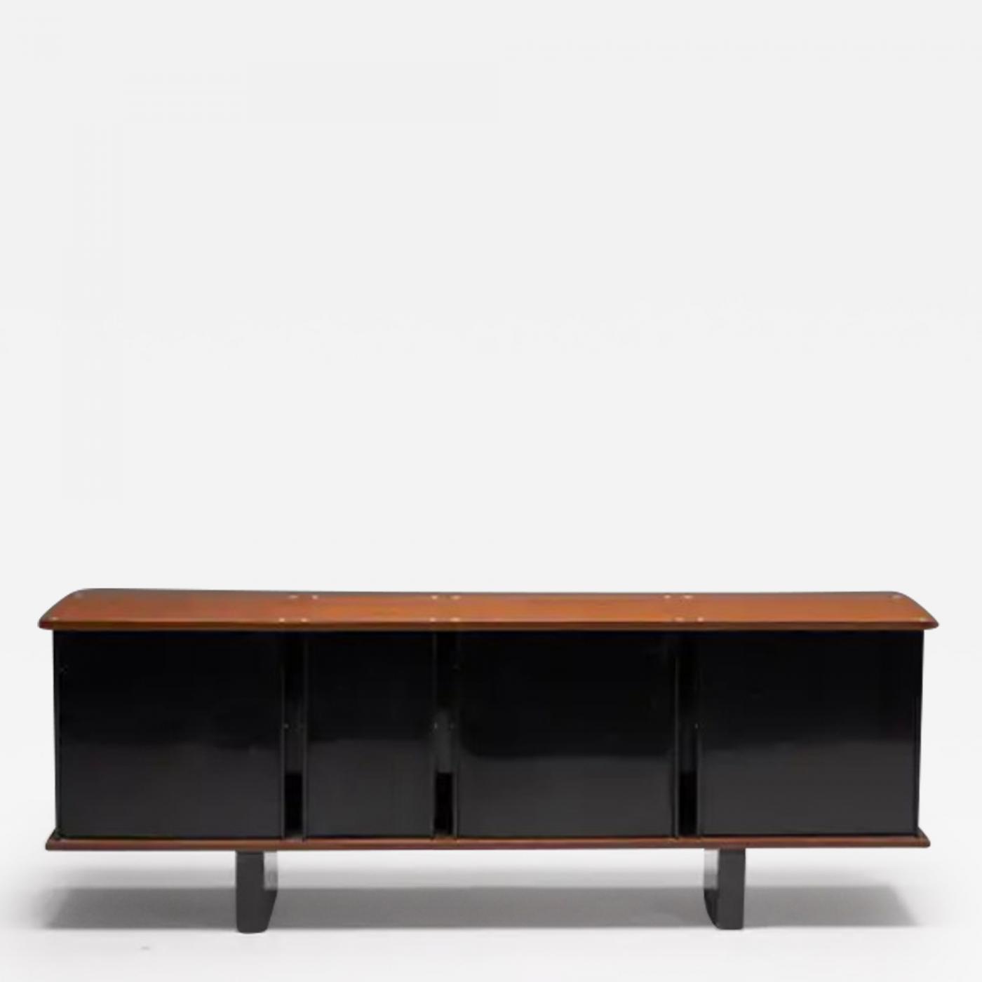 Sideboard 'Bloc' by Charlotte Perriand, a timeless piece designed for Cité Cansado. Composed of sturdy coreboard shelves veneered in a range of different woods, reinforced by sleek black lacquered sheet metal backs and side panels, this sideboard guarantees unparalleled rigidity. The innovative perforated side panels elegantly accommodate racks for shelves or drawers. To ensure seamless functionality, the smooth sliding doors are expertly crafted from melamine over masonite, providing a silent and effortless glide.