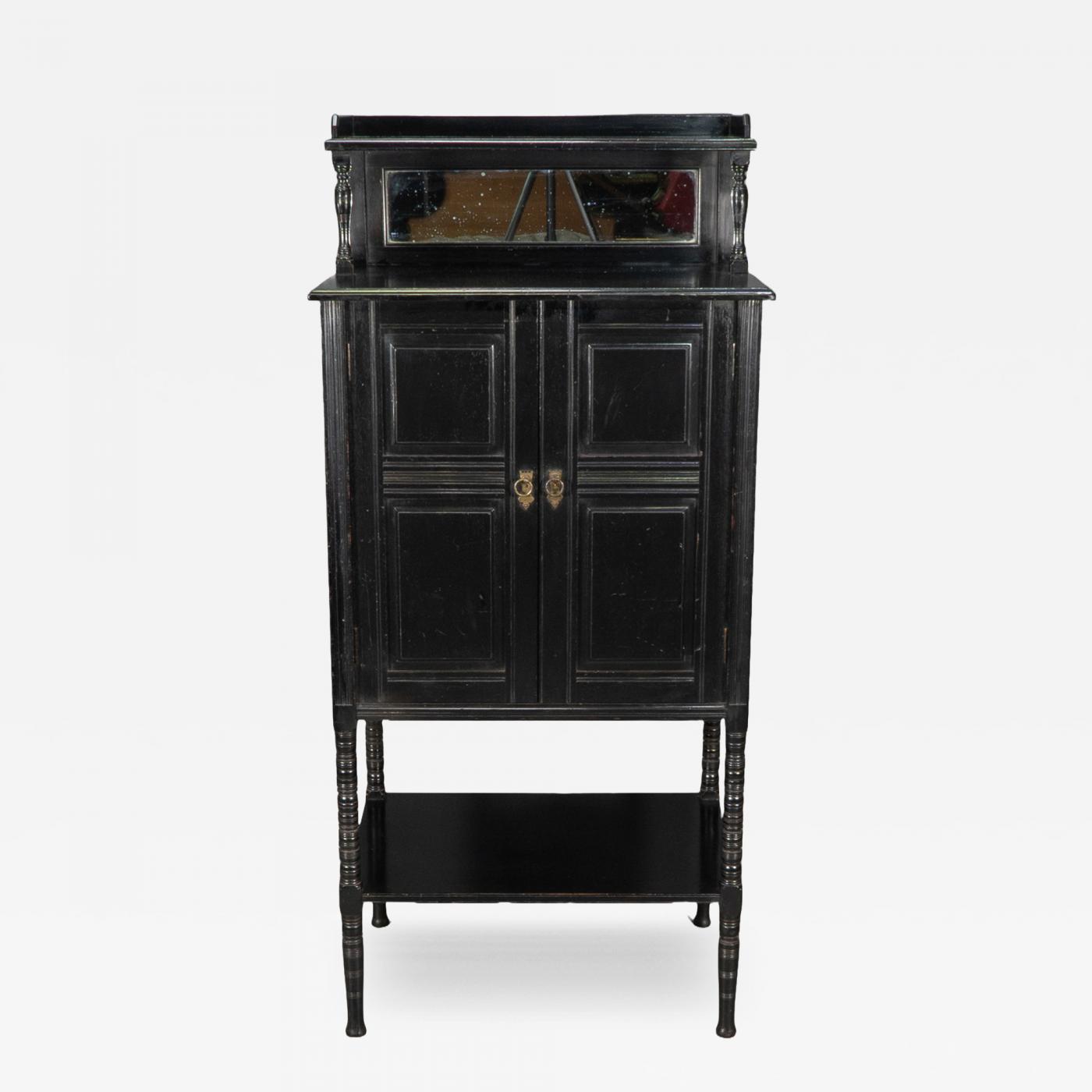Depth: 15.94" || Style of E. W. Godwin. An Aesthetic Movement ebonized cabinet. The upper shelf with a 3/4 gallery on turned supports with a bevelled mirror below and display area in front. The two door cupboard with four fielded panels centred by tramline decoration and brass handles opening to reveal a single adjustable sliding drawer. Standing on ring turned legs united by a lower shelf.