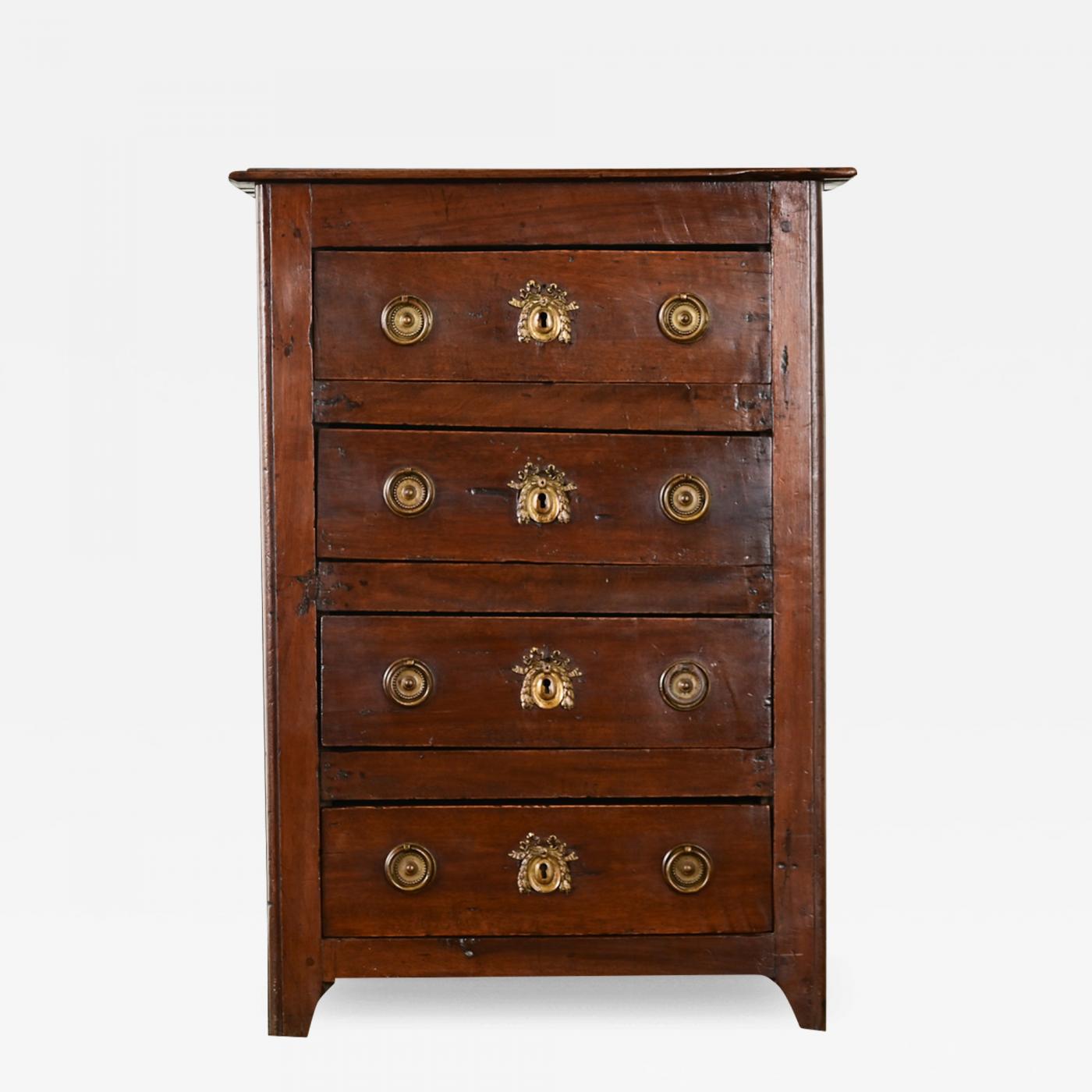 Darling, petite commode from France, early 19th century. Made from walnut in simple construction, the wood grain has rich color and pattern, the plain top surface sits over a case with four drawers and paneled sides. Stunning, Louis XVI hardware on the drawer fronts lends functional ornamentation to the piece in the forms of ring pulls and escutcheon plates. Cleaned and polished with a French paste wax, this piece is ready to join your interior. Please view the detailed images.