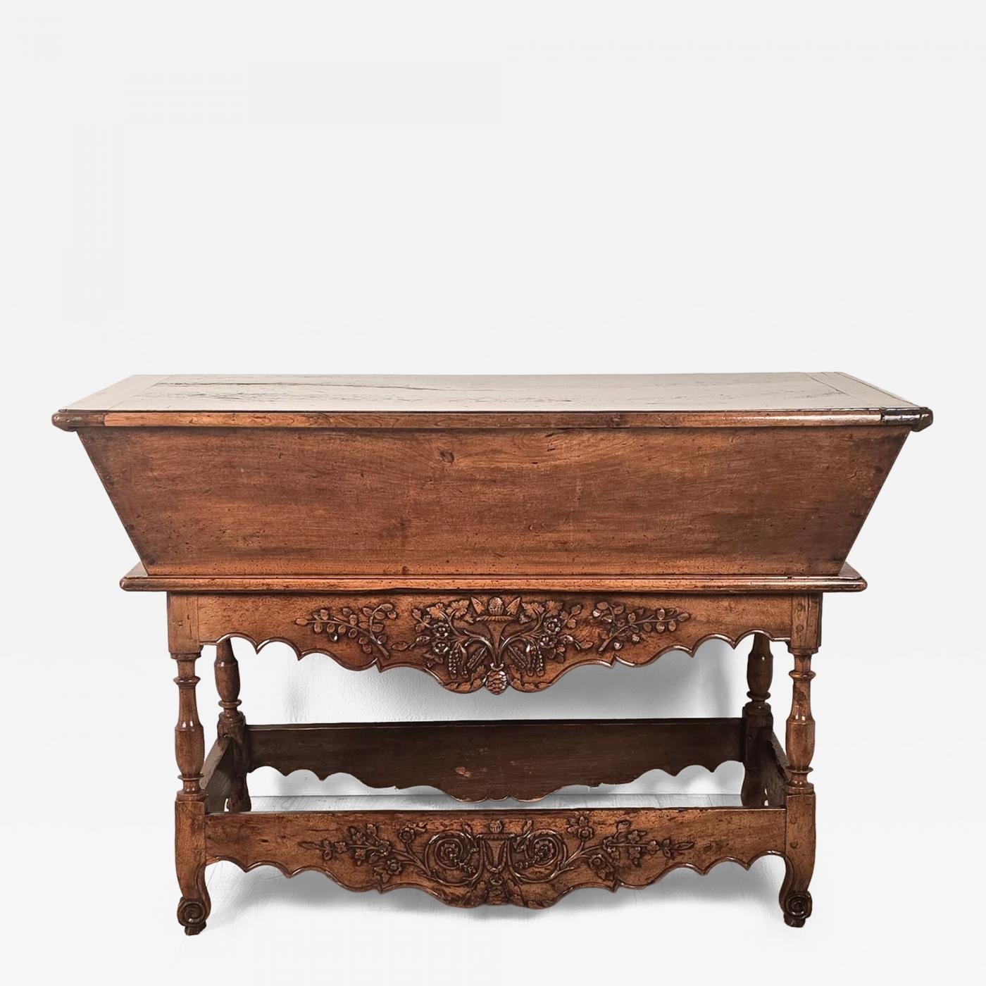 A French provincial walnut dough bin, circa 1800. Old worm damage to inside of top, to inside of bin, and to stretchers.