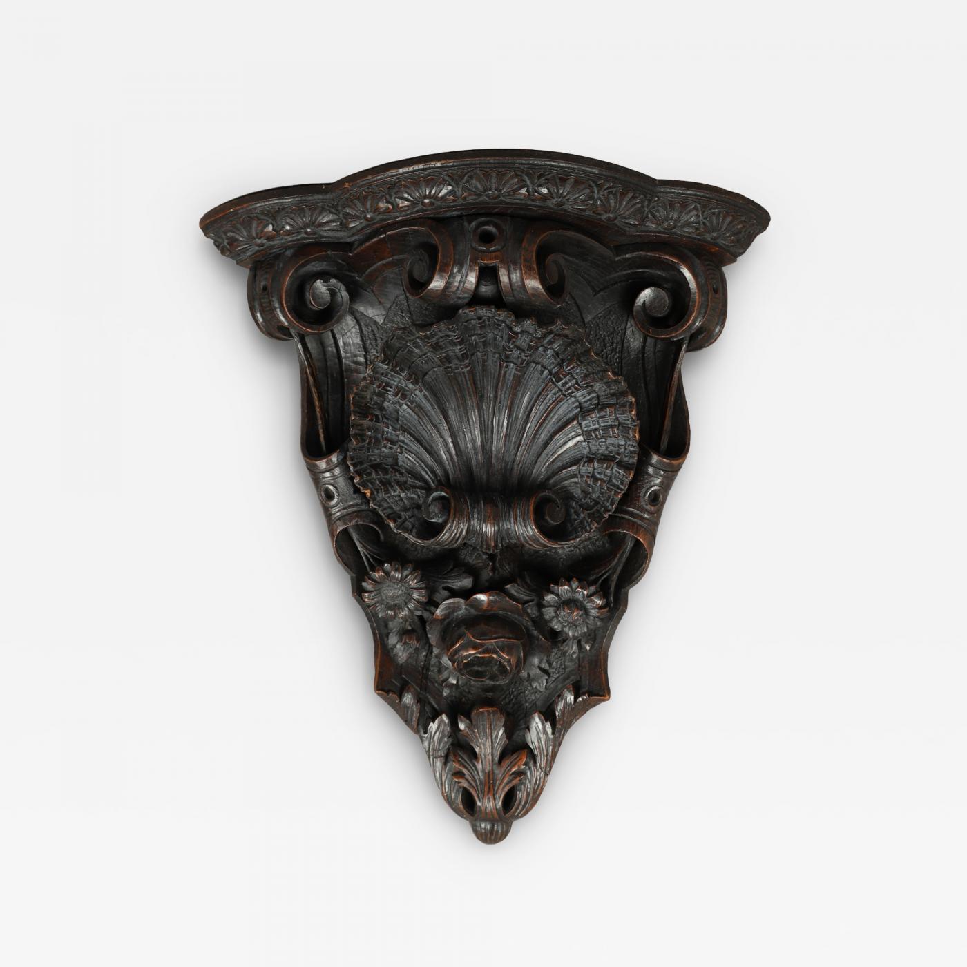 An exceptional, finely carved and executed corner bracket shelf. The later shaped top with a half-rosette carved boarder sits above a carved scallop shell surmounted by strapwork, scrolls, a floral swag and acanthus motifs.