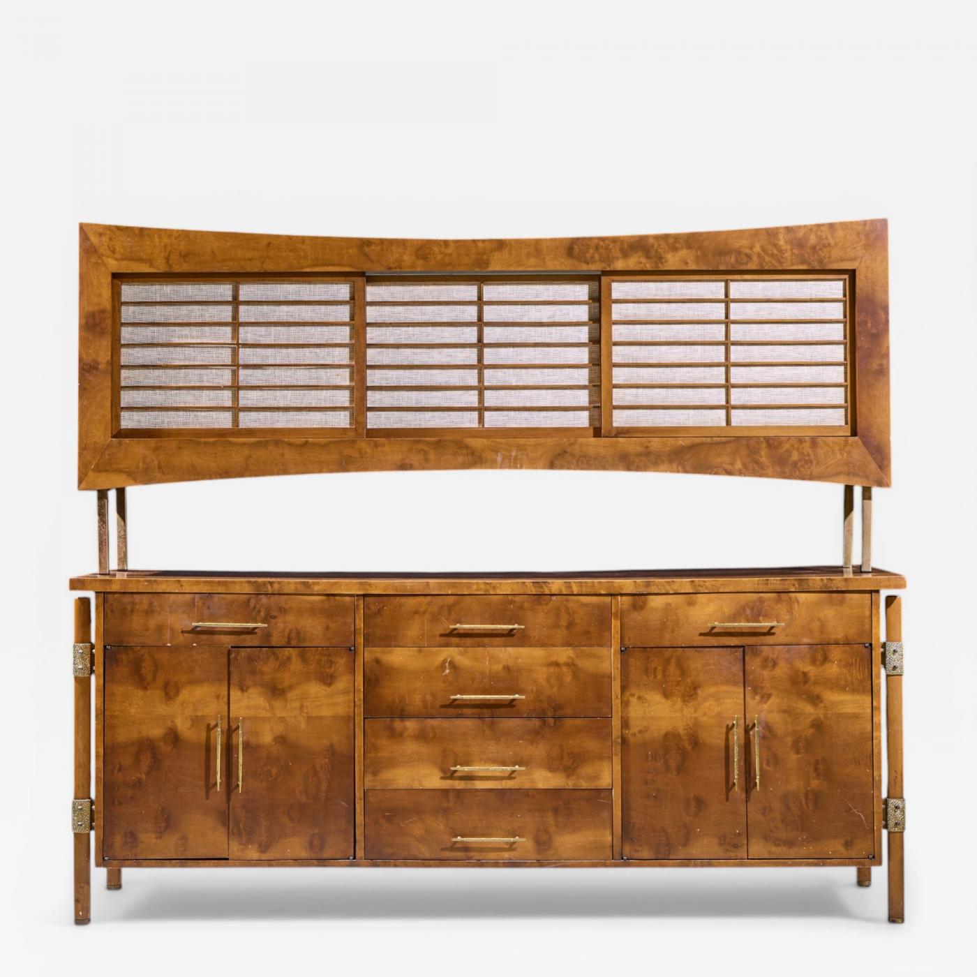 Harold Schwartz for Romweber Mid Century Burlwood and Brass Credenza and Hutch
