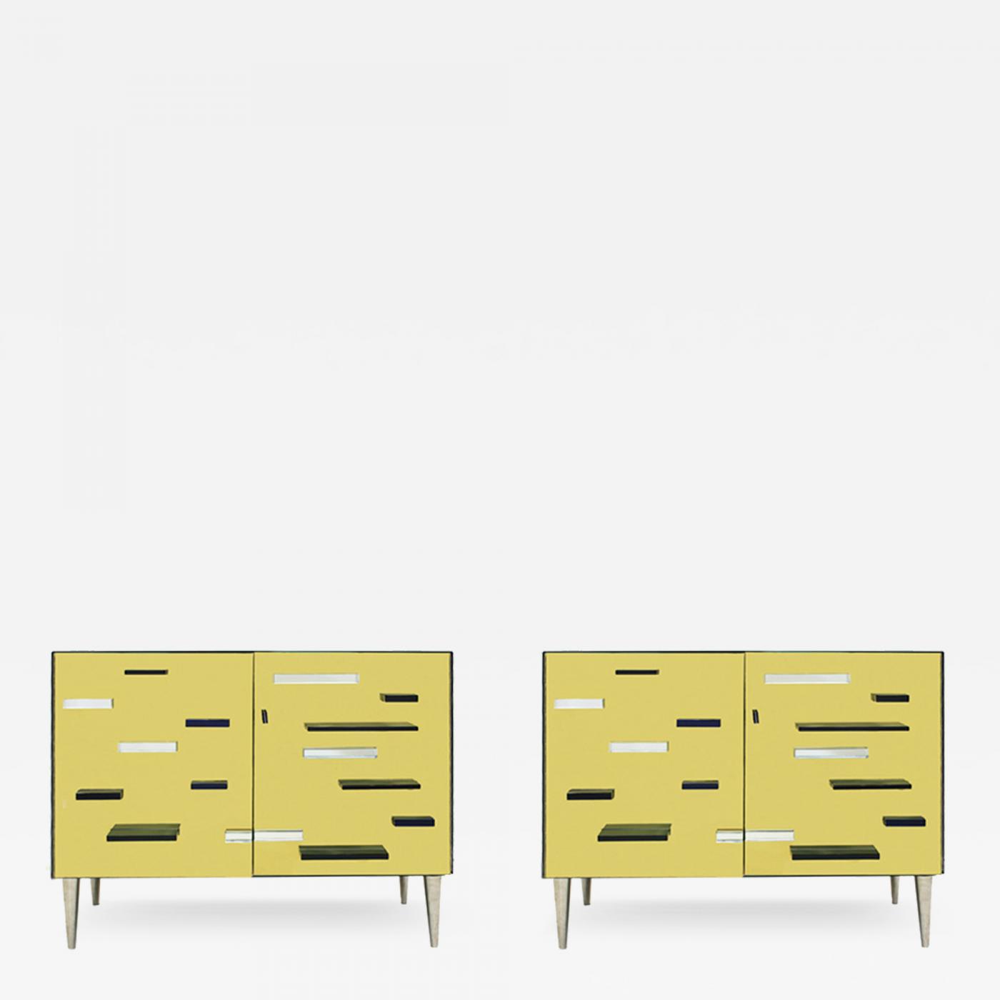 A wonderful and very elegant contemporary pair of Italian cabinets. Structure made of solid wood covered in mirror and gold glass with navy blue Murano glass decorative pieces, playing a geometric movement on the surface. One wooden shelf inside and metal inches. Conical feet made of solid brass. Made in Italy.