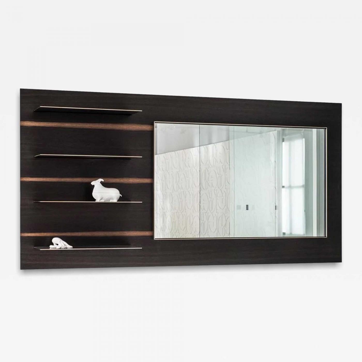 The wood body of this floating unit has Patinated Bronze shelves with burnished edges and a Bronze framed mirror. Version for a TV mount is also available. Shown in Dark Fumed White Oak. Available in other woods and metal finishes.