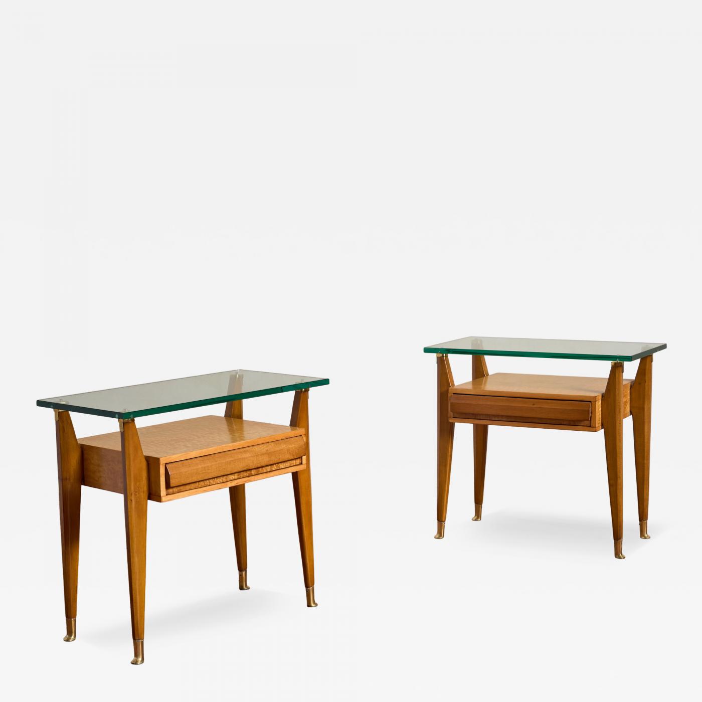 Fantastic Nightstands by La Permanente Mobili Cantù , Italy 1950 Angular legs with brass feet and floating thick glass tops. Matching dresser and mirror available