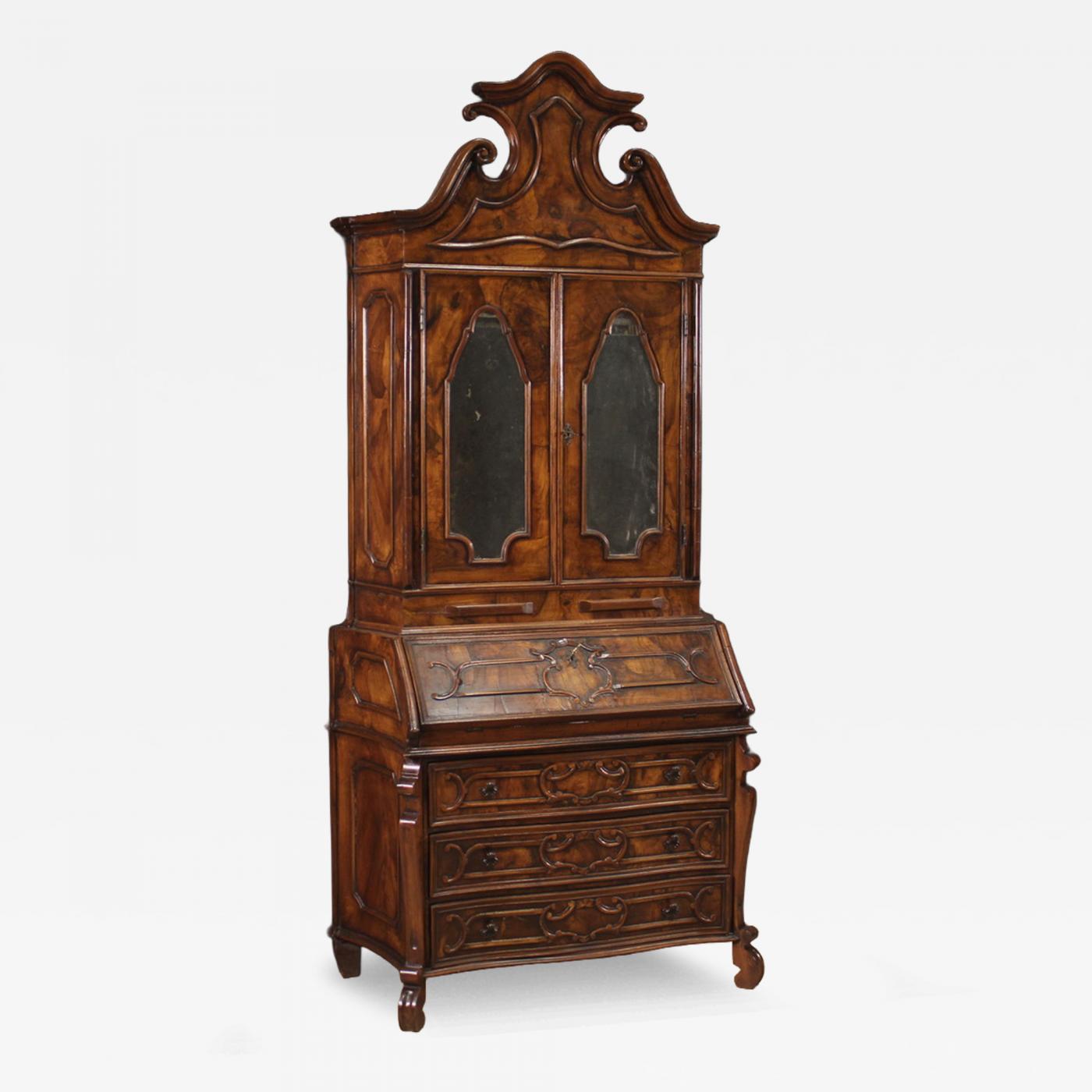 Lombard trumeau from the mid-20th century. Double body furniture carved in walnut, burl and beech of a beautiful line and pleasant decor. Lower body equipped with three drawers and desk of good capacity and service. Interior of the bureau, complete with working key, equipped with two small drawers, two compartments for documents and a desk top of a fair size and service (see photo). Upper body complete with removable candle holder shelves (see photo) and two doors with antiqued built-in mirrors. Interior with two fixed shelves (see photo) of moderate capacity. Trumeau slightly wavy on the front and on the sides, of pleasant decoration, ideal for placing in a living room or studio. In good condition with some minor signs of wear.