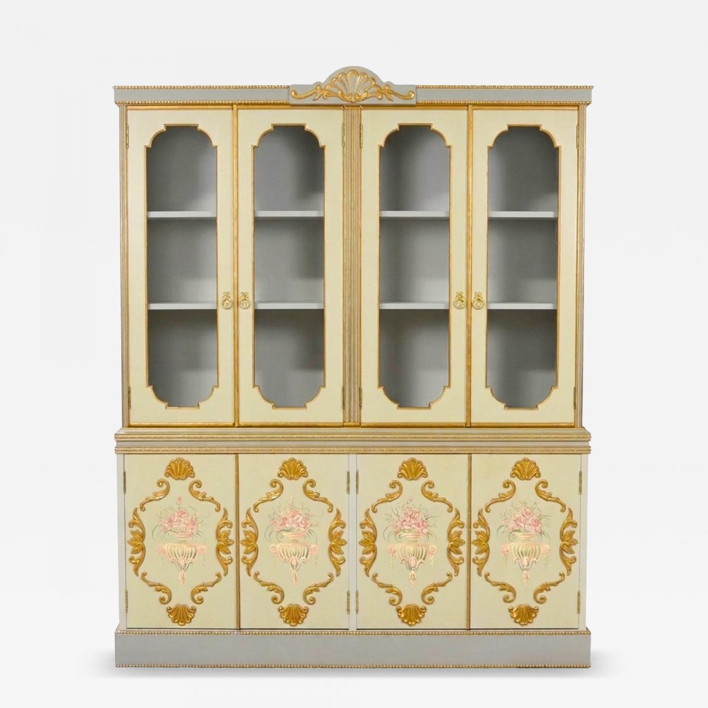 The interior is equally well finished, featuring a hand-painted gray backdrop with additional floral detailing and four integrated light strips installed at the top, providing elegant illumination for display if needs be by simple rewiring process. The upper section has two pairs of glass doors opening to an interior fitted with two fixed shelves with plate grooves; the shelving supports are original and not freely adjustable. The lower section is fitted with two pairs of blind doors, decorated with gilt appliqué scrolls, fan motifs, and hand-painted floral reserves. The doors open with a push-release mechanism and conceal interior storage compartments, each fitted with one adjustable shelf. The cabinet is notable for the quality of its painted decoration and gilt work, demonstrating fine Italian craftsmanship of the mid-20th century. This versatile piece can be used as a china cabinet, vitrine, or bookcase, and would complement both traditional and transitional interiors. Overall in good condition, with minor wear consistent with age and use. It Measures approximately : 78" H x 62" W x 13 1/4" D. -