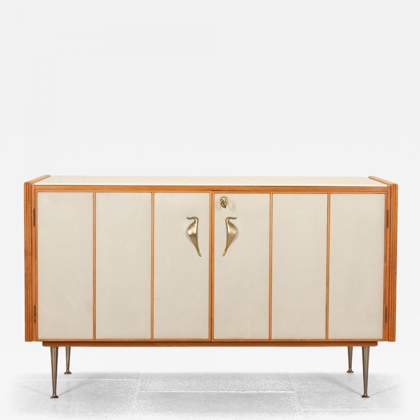 With Skaï panels and brass handles. Interior in mahogany with half width drawers. Circa 1960. -