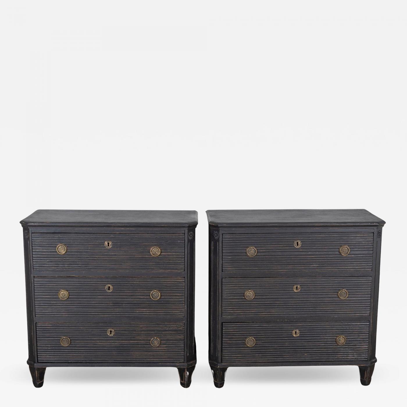 This striking pair of Swedish chests of drawers, dating to circa 1880, showcases the timeless elegance and craftsmanship of late 19th-century Scandinavian design. Each chest features three spacious drawers with beautifully patinated, reeded fronts that add depth and texture to the clean, neoclassical silhouette. The deep, dark painted finish has developed a rich, timeworn surface over the years, highlighting the natural grain and lending a sophisticated, contemporary edge to the antique form. Original brass ring pulls and escutcheons punctuate the façade with subtle gleam, while tapered legs and fluted corner details reflect classical influences. Perfect as statement storage pieces in a bedroom, living room, or hallway, they offer a rare combination of functionality, historical character, and understated refinement. Versatile enough to complement both traditional and modern interiors, this pair embodies the enduring appeal of Swedish craftsmanship and design heritage.