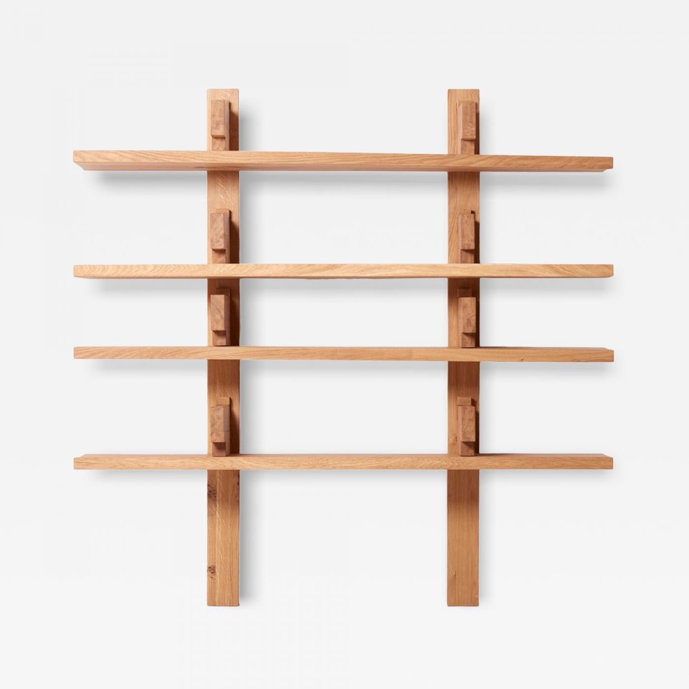 First presented in 1967 at the Salon des Arts Ménagers, the 'B17' surprises with its discretion and elegance, courtesy of the harmony displayed between the lines of the shelves and vertical upright supports. While the vertical posts can rest on the ground, a wall mounting is possible as well. Due to Chapo's design of the support fitting into the vertical upright, the shelf becomes solidly fixed under its own weight. In a balance between gravity and force, the more weight placed on the shelf, the better seated its components become in the vertical upright. Executed in either elm or oak wood and finished in a simple and natural oil of linseed and turpentine.