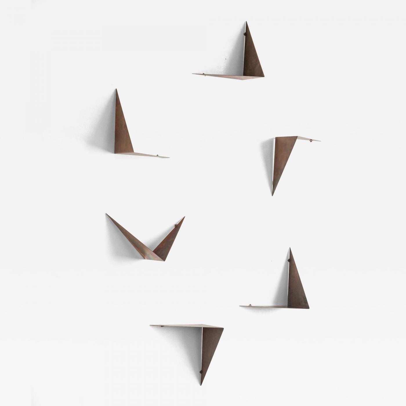 Set of six Danish mid-century copper "Butterfly" wall shelves, by Poul Cadovius. Where the shelves can be hung in different ways. Denmark, ca 1955.