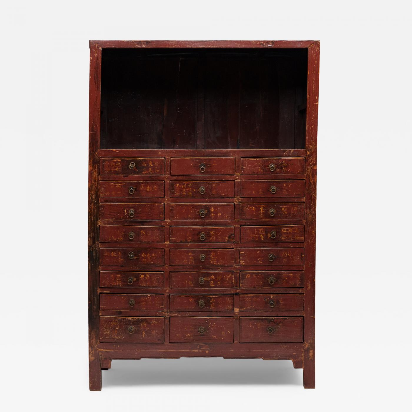 Depth: 21.75" // This gorgeous lacquered cabinet is a 19th-century Chinese apothecary chest, originally used in a pharmacy to organize and store traditional herbal medicines. A statement piece brilliantly constructed with mortise and tenon joinery, it has twenty-four shallow drawers, each fitted with multiple interior compartments. Each drawer is patterned with traces of hand-painted characters and fitted with a round brass pull with a backplate modeled after Chinese coins (qián). A large upper compartment provides additional storage, ideal today as a shelf for books, pottery or sculptures. The apothecary cabinet is cloaked in a richly aged red lacquer finish, textured with subtle crazing and stabilized with a recent clear coat.