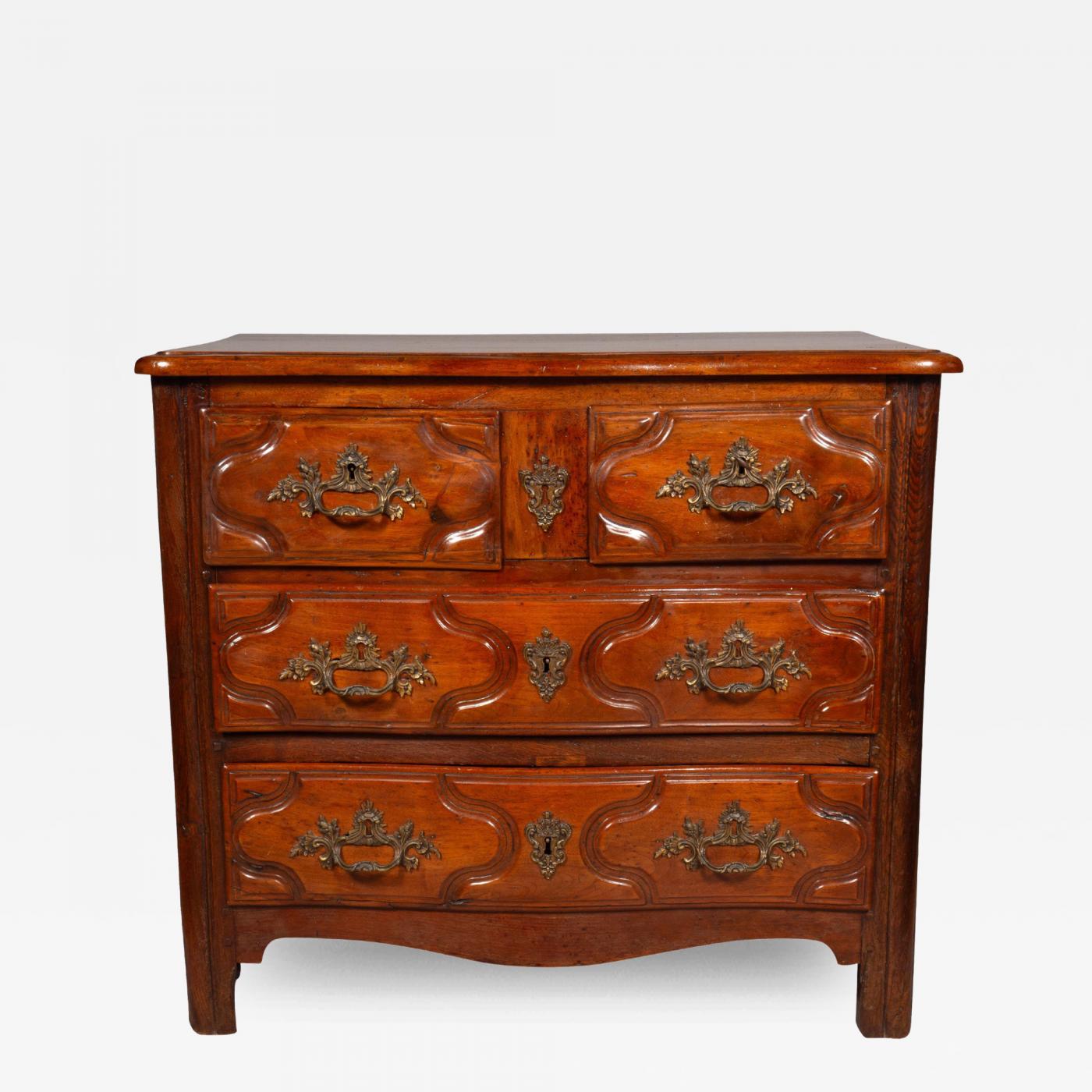 Rectangular serpentine shape with two over two drawers with brass rocaille handles and escutcheons. Straight stile feet.