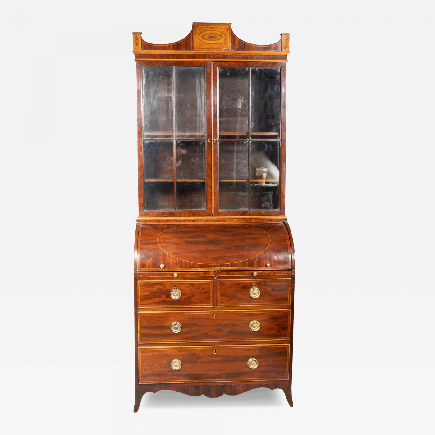 The arched cornice with oval paterae inlay over a pair of glass doors enclosing shelves. The base with roll top desk opening to a fitted compartments and slide out writing surface. Two over two drawers with French feet. Provenance; Hilfiger Nantucket residence.