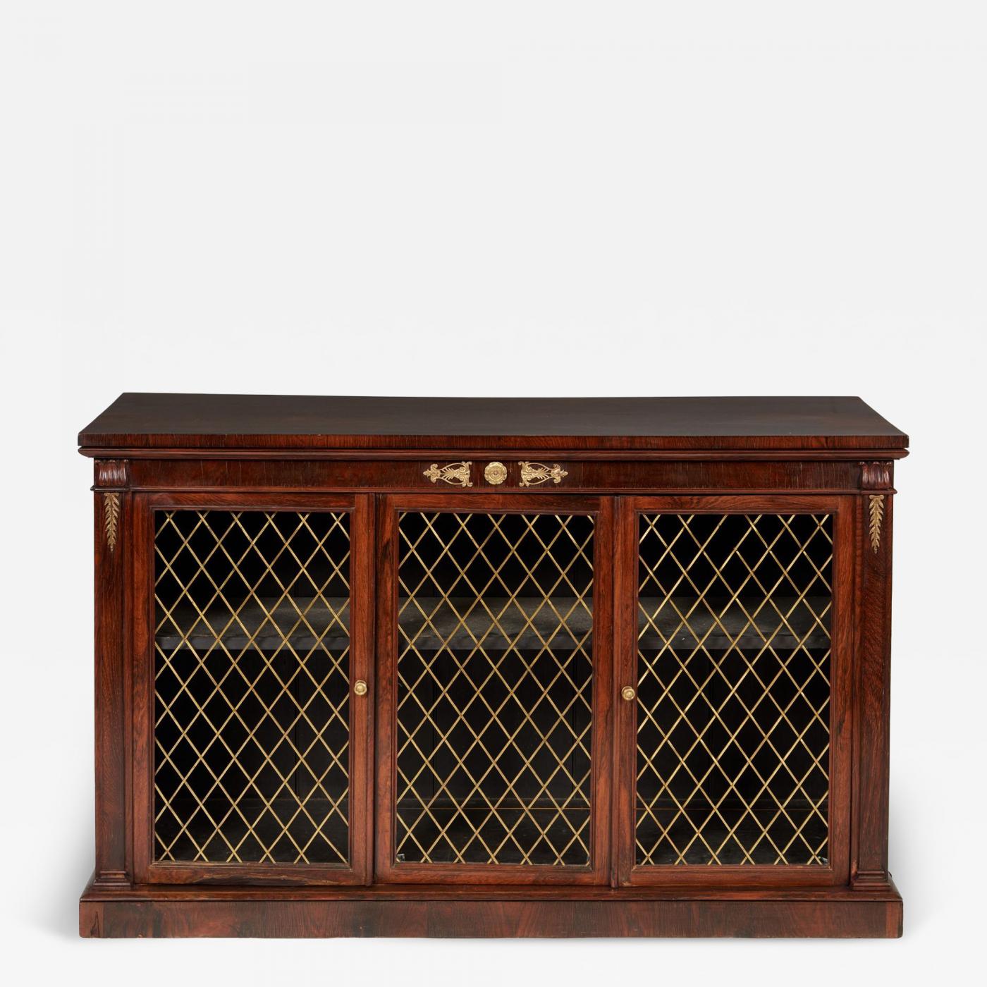 Regency period rosewood low bookcase/credenza having three doors retaining original brass grill doors and gilt bronze mounts, standing on plinth base. England circa 1830.