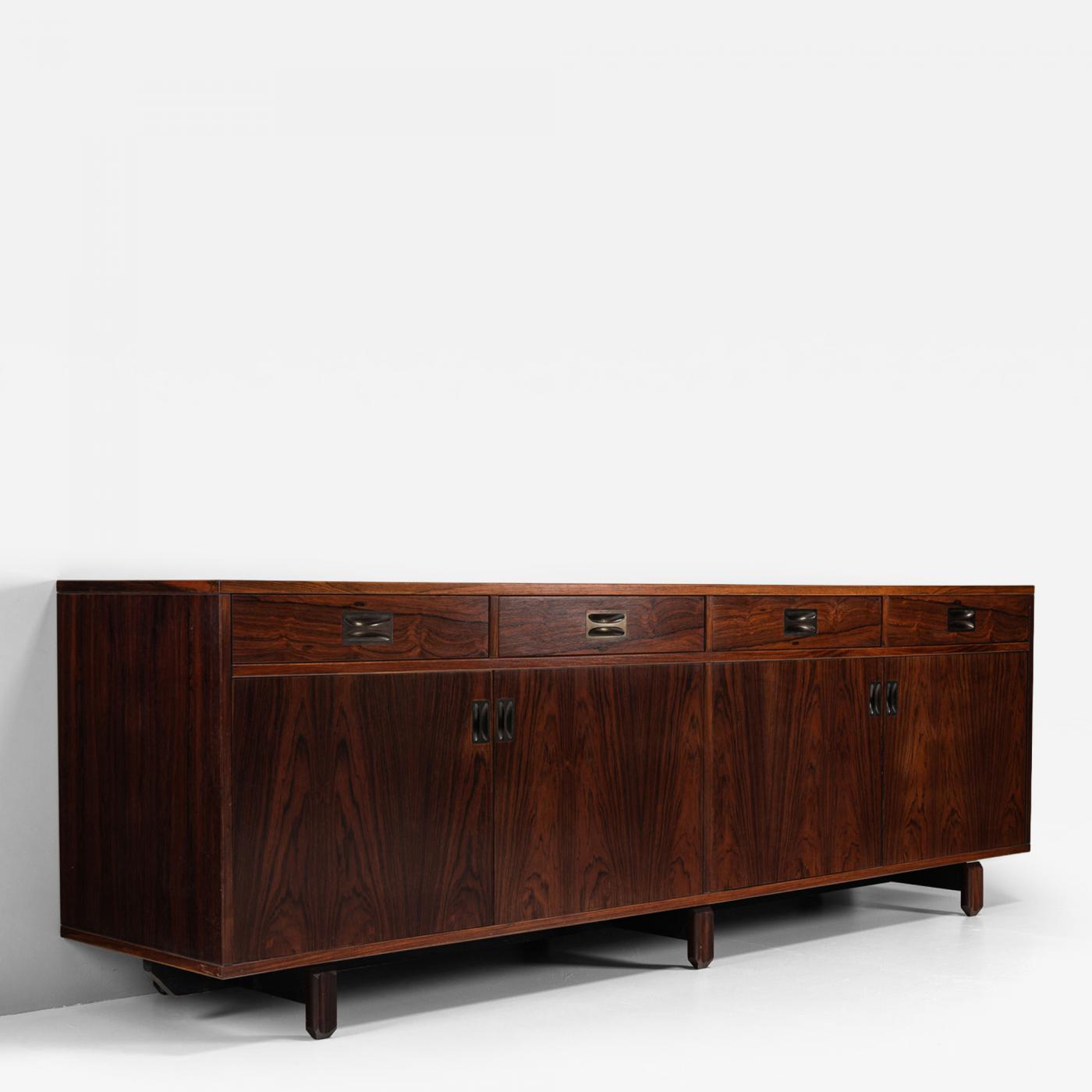 Constructed from solid wood and clad in highly figured rosewood veneer, the sideboard features four drawers across the top and four doors below. The grain of the rosewood is deliberately aligned, forming a continuous pattern that flows across the front. Each drawer is fitted with inset metal pulls, patinated over time, that subtly echo the utilitarian elegance typical of Italian modernist design. Below, paired cabinet doors open to reveal ample storage. The credenza is supported by recessed legs, giving it a slightly elevated and grounded stance.
