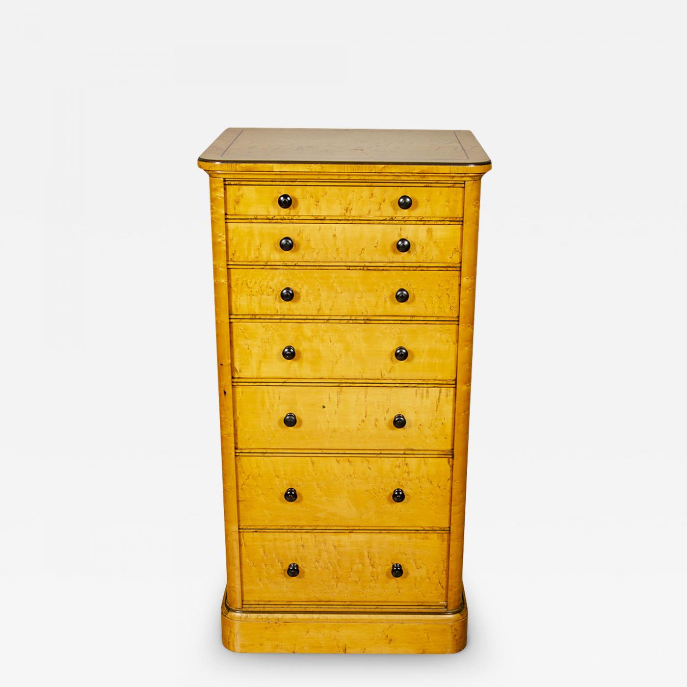 With squarish top with ebony stringing over seven graduated drawers with wood knobs and swinging lock mechanism which locks all drawers, raised on a plinth base. Holland & Sons was an important maker of furniture and rival of Gillows. Commissions include Sandringham House, Balmoral Castle, Windsor Castle and the apartments of the Prince and Princess of Wales at Marlborough House. Stamped on top of drawer Holland & Sons.