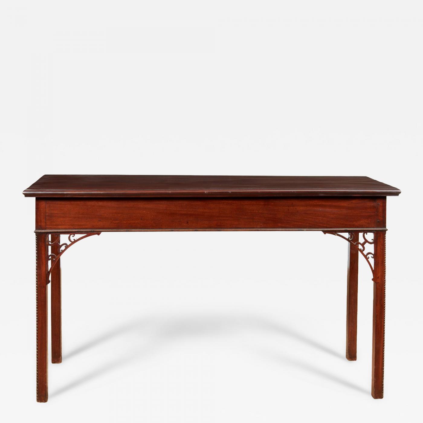 18th century mahogany serving or console table, the single plank top with shaped edge over apron with lower molding and exaggerated pierced spandrels, standing on square legs, the outer edges with beaded carving, the whole with pleasing color and in good original condition.