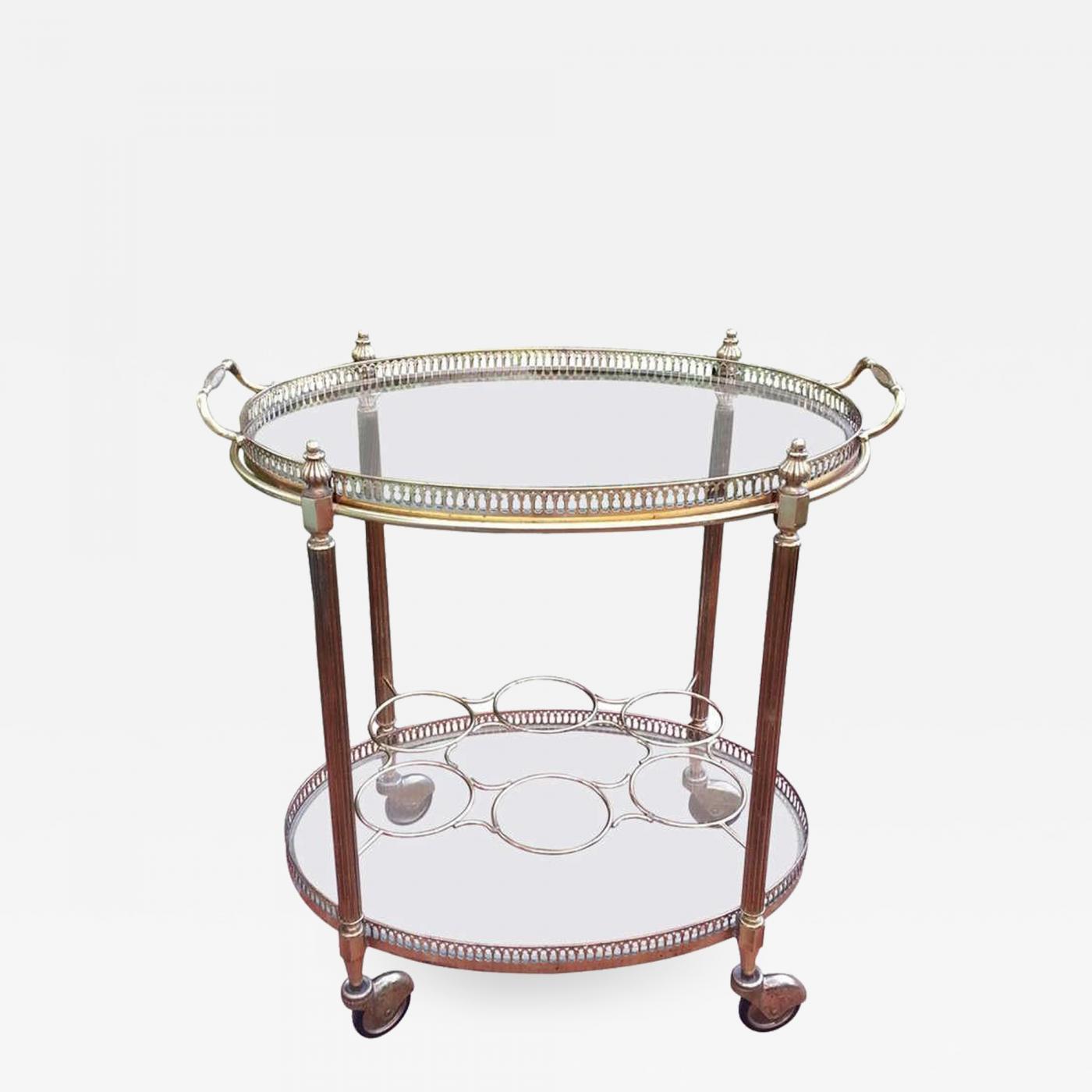 1960s Brass oval bar cart with removable gallery tray and 6 bottle holders.